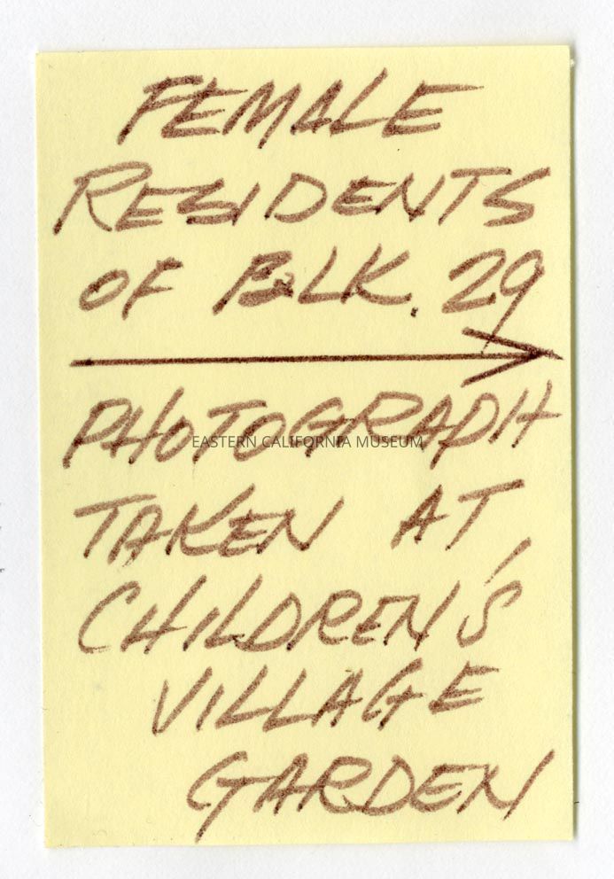 Handwritten label that says, "Female residents of Blk. 29. Photograph taken at Children's Village garden."