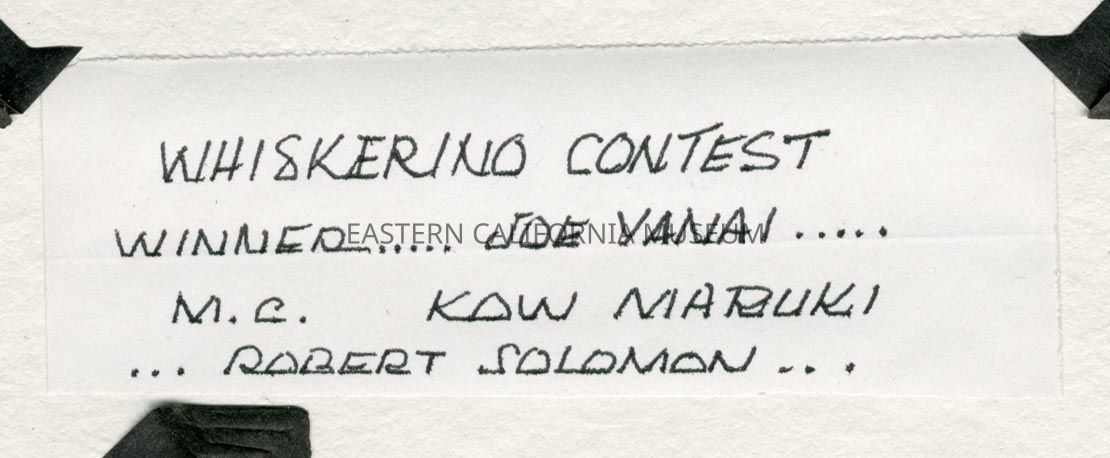 Handwritten label that says, "Whiskerino Contest winner Joe Yanai, M. C. Know Maruki, Robert Solomon."