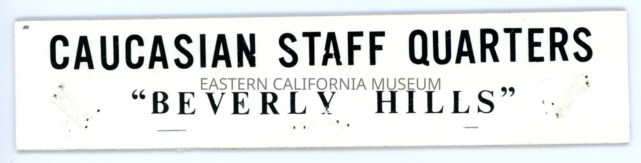 Label that says, "Caucasian Staff Quarters "Beverly Hills"."