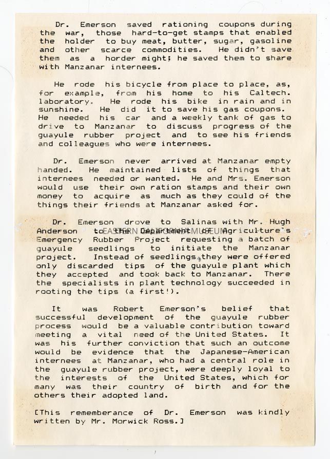 Biographical sketch of Robert Emerson written by Morwick Ross. Professor Robert Emerson was involved throughout the war with the guayule rubber project.