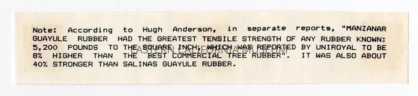 Label that says: "Note: According to Hugh Anderson, in separate reports, "Manzanar Guayule Rubber had the greatest tensile strength of any rubber known: 5,200 pounds to the square inch, which was reported by uniroyal to be 8% higher than the best commercial tree rubber." It was also about 40% stronger than Salinas Guayule Rubber."Collection