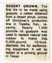 Desert grown. The first tire to be made using guayule, a rubber obtained from a desert shrub, comes off Goodyear's production line in Topeka, Kan., recently. Nearly 1,900 pounds of guayule was used to replace natural tree rubber to make this 5,000 pound, 10 foot diameter tire for earthmoving equipment. It will be tested at a proving ground in Texas.Collection