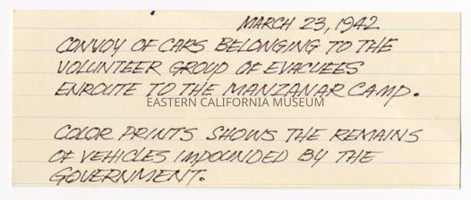 Handwritten label that says, "March 23, 1942. Convoy of cars belonging to the volunteer group of evacuees enroute to the Manzanar Camp. Color prints shows the remains of vehicles impounded by the government."Collection