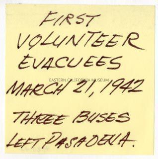 Handwritten label that says, "First volunteer evacuees March 21, 1942. Three buses left Pasadena."