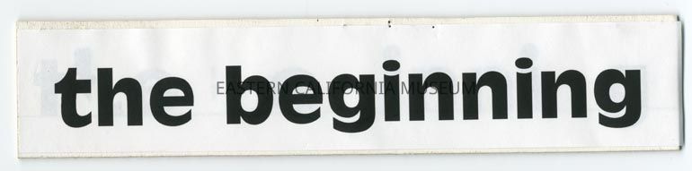 Label that says, "The beginning." The creator originally used peel-and-stick letters, but over time they deteriorated. At some point a similar computer-printed label was affixed over the top of the original.Collection