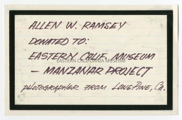 Handwritten label that says, "Allen [Allan] W. Ramsey / Donated to: Eastern California Museum / Manzanar Project / Photographer from Lone Pine, CA."