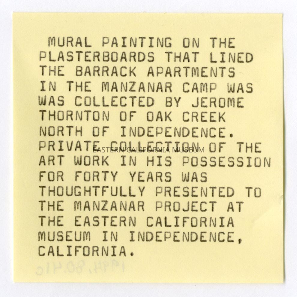 Handwritten label that says, "Mural painting on the plasterboards that lined the barrack apartments in the Manzanar Camp. Was collected by Jerome Thornton of Oak Creek, north of Independence. The artwork was in his possession for 40 years and was thoughtfully presented to the Manzanar Project at the Eastern California Museum in Independence, CA."Collection