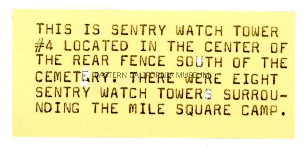 Typewritten label that says, "This is sentry watch tower #4 located in the center of the rear fence south of the cemetery. There were eight sentry watch towers surrounding the mile square camp."Collection