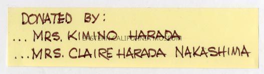 Handwritten label that says, "Donated by: Mrs. Kimino Harada...Mrs. Claire Harada Nakashima."
