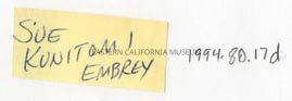 Handwritten label that says, "Sue Kunitomi Embrey."