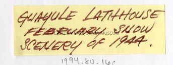 Handwritten label that says, "Guayule lathhouse February snow scenery of 1944."
