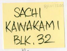 Handwritten label that says, "Sachi Kawakami Blk. 32."