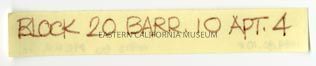 Handwritten label that says, "Block 20 Barr. 10 Apt. 4." It refers to photo 1994.82.2.4.