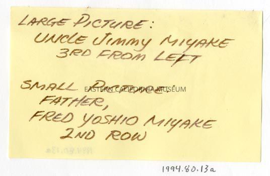 Handwritten label that says, "Large picture: Uncle Jimmy Miyake 3rd from left. Small picture: Father, Fred Yoshio Miyake 2nd row."