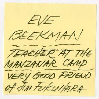 Handwritten label that says, "Eve Beekman, Teacher at the Manzanar Camp, Very Good Friend of Jim Fukuhara."
