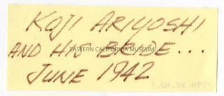 Handwritten label that says, "Koji Ariyoshi and his bride...June 1942."