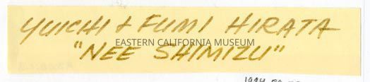 Handwritten label that says, "Yuichi and Fumi Hirata 'Nee Shimizu'."
