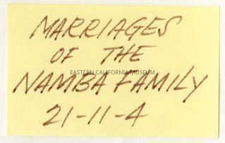 Handwritten label that says, "Marriages of the Namba family 21-11-4."