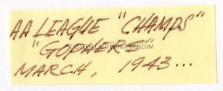 Handwritten label that says, "AA League 'Champs' 'Gophers' March 1943."