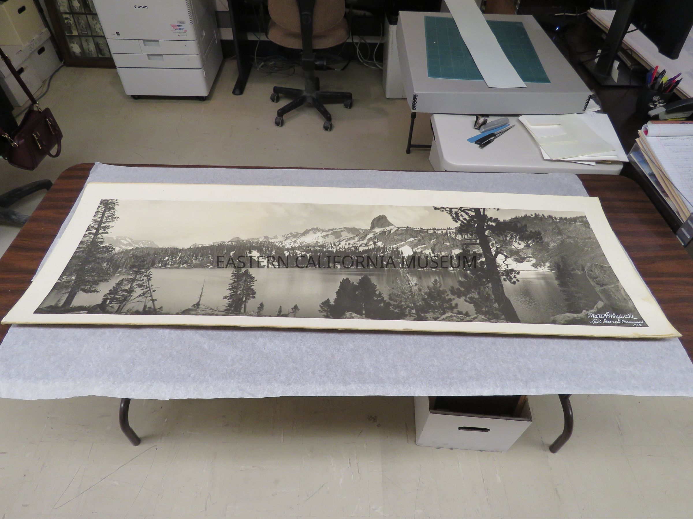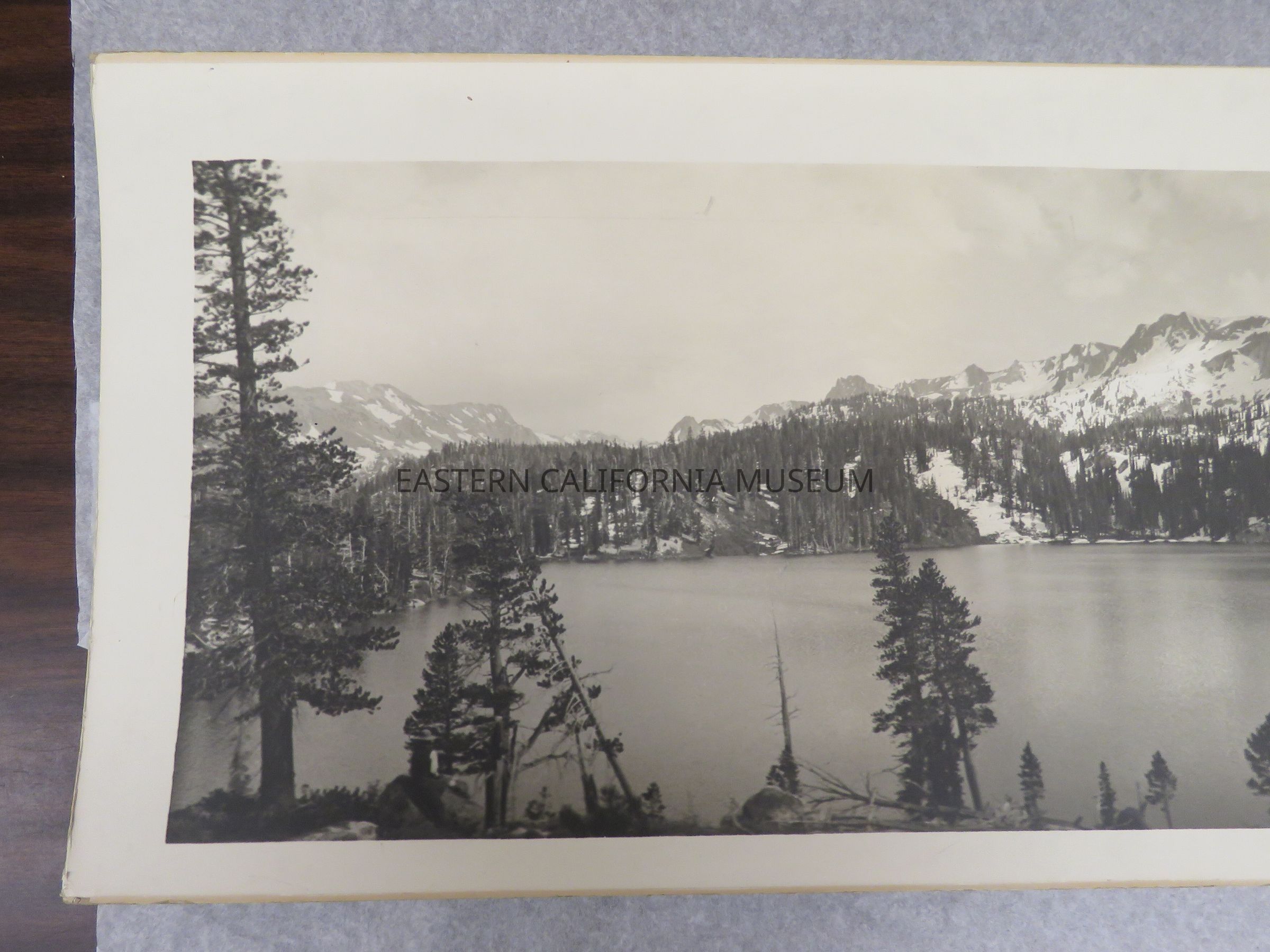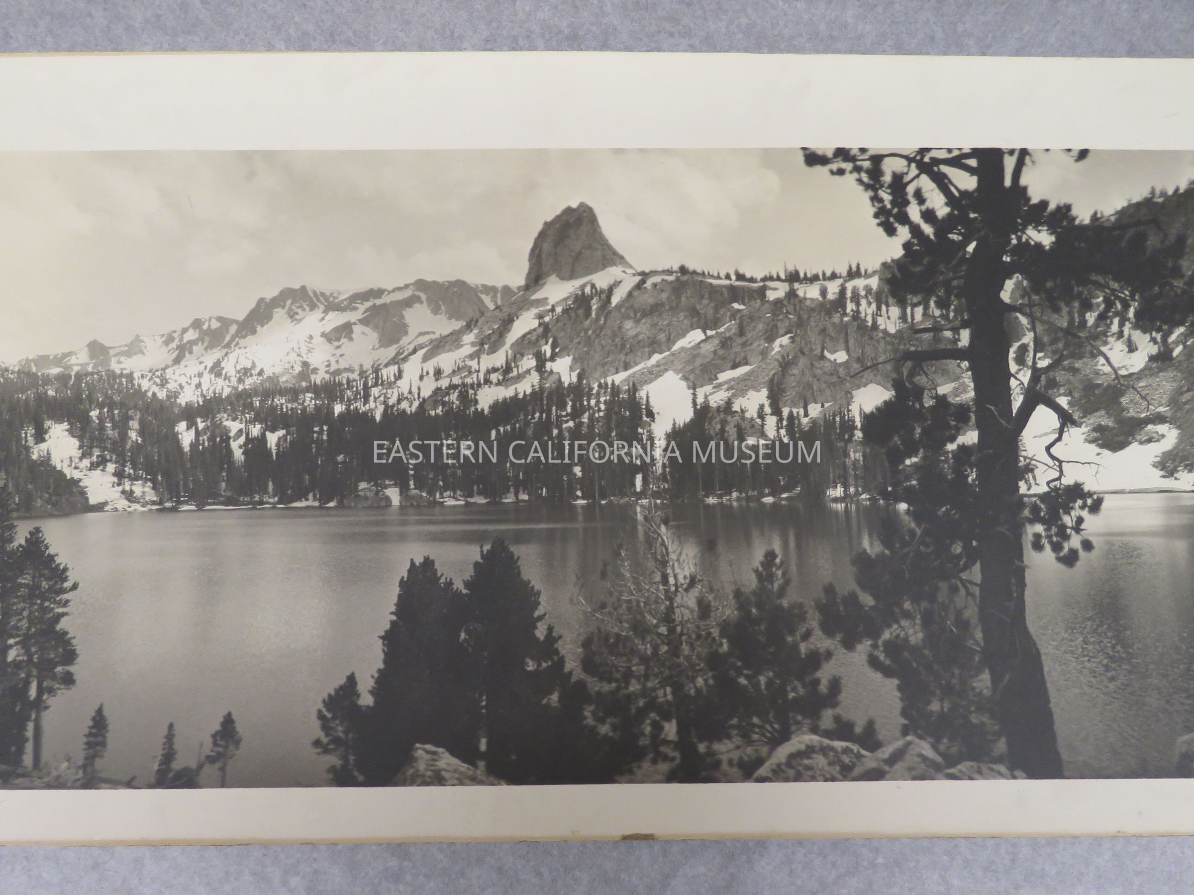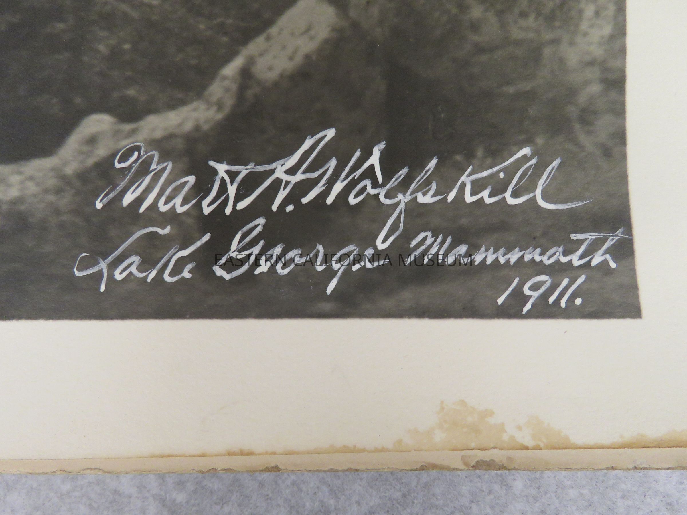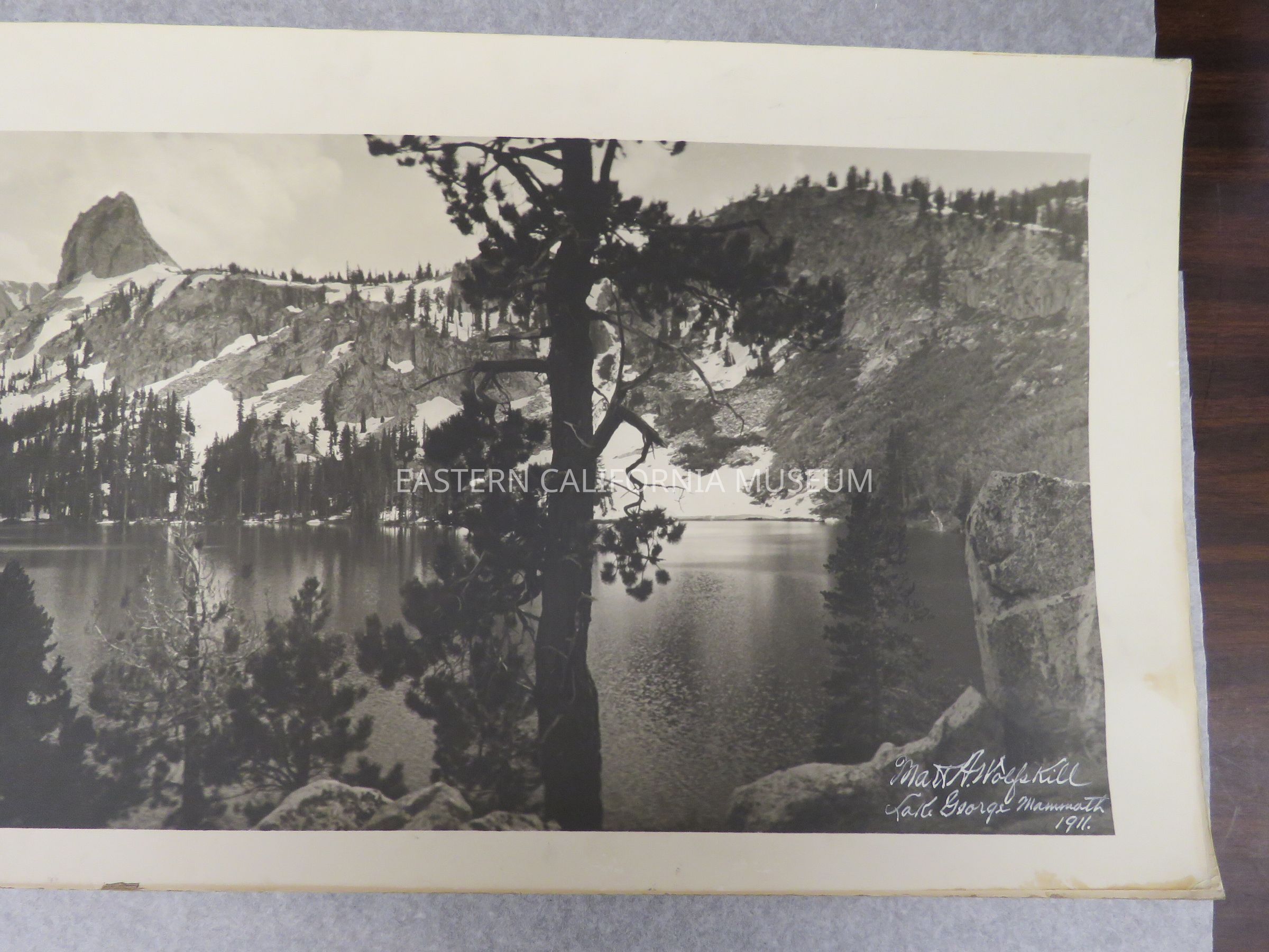 Photo of Lake George, Mammoth (and Crystal Crag?). There is lots of snow on oppsite side of lake. Signed by Matt A. Wolfskill, 1911. Same photo as 1993.45.23.Made/Created