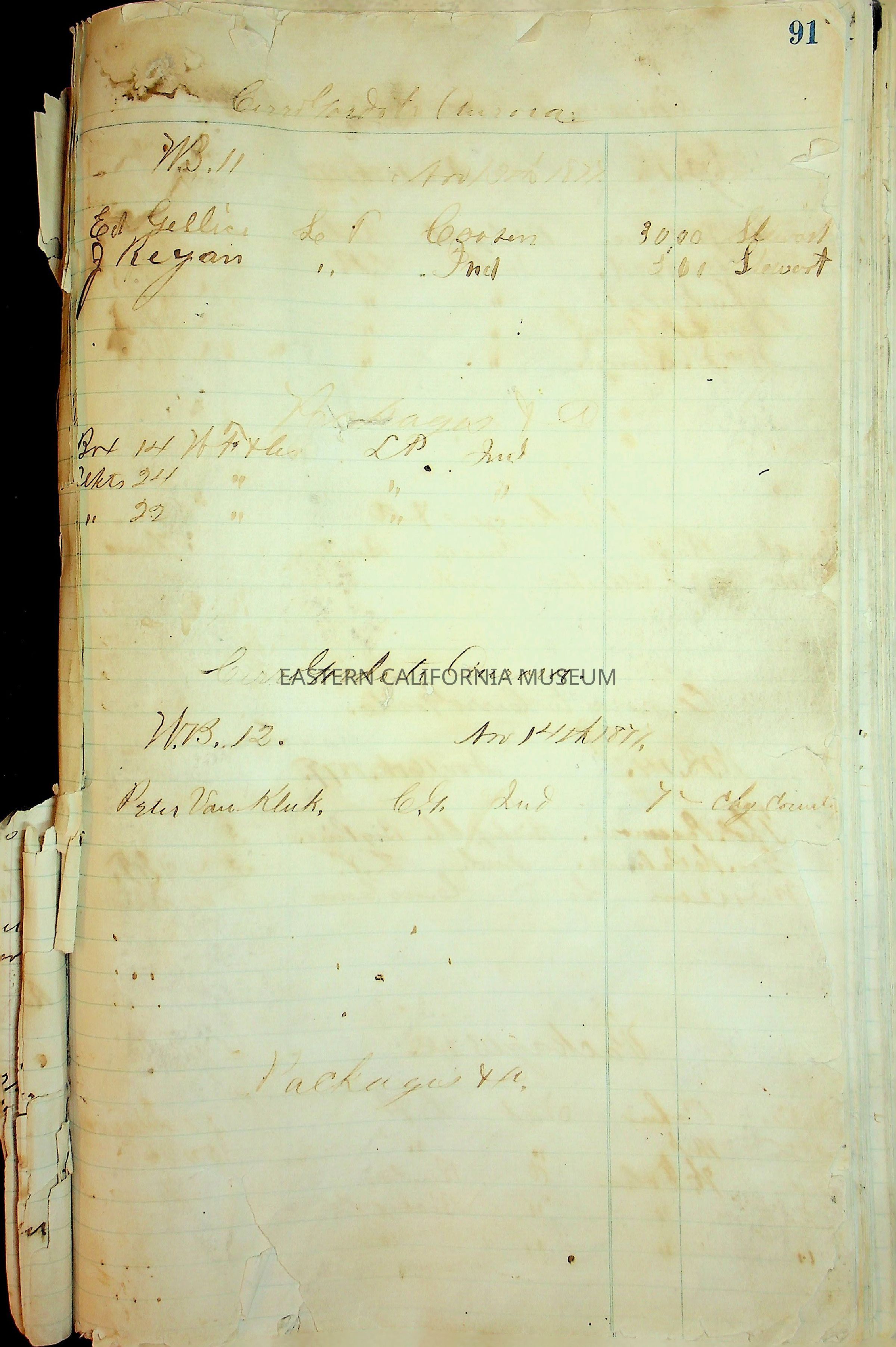 Logbook or ledger for the stage between Cerro Gordo and Aurora from 1877-1878. It also sometimes tracks the stage between Lone Pine and Cerro Gordo and other trips. It tracks packages as well as people (not all people are named--there is a "Frenchman" and a "Chinaman" listed).
