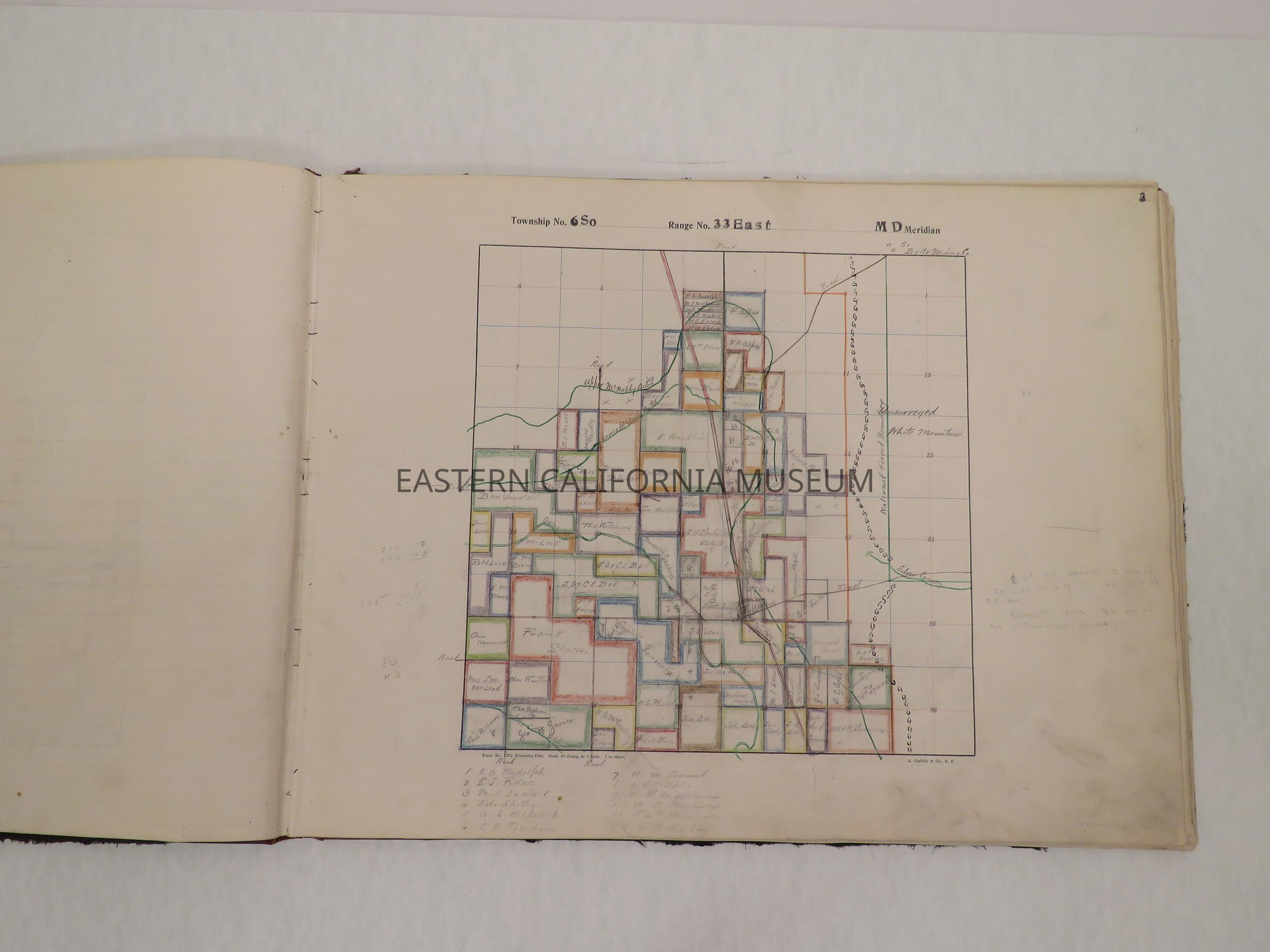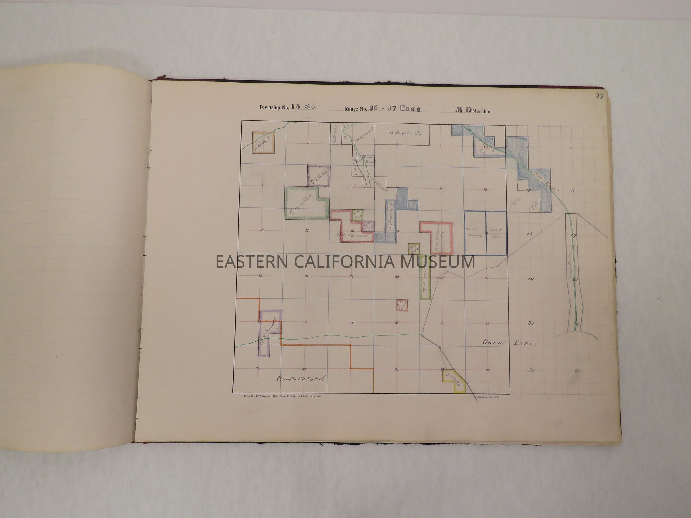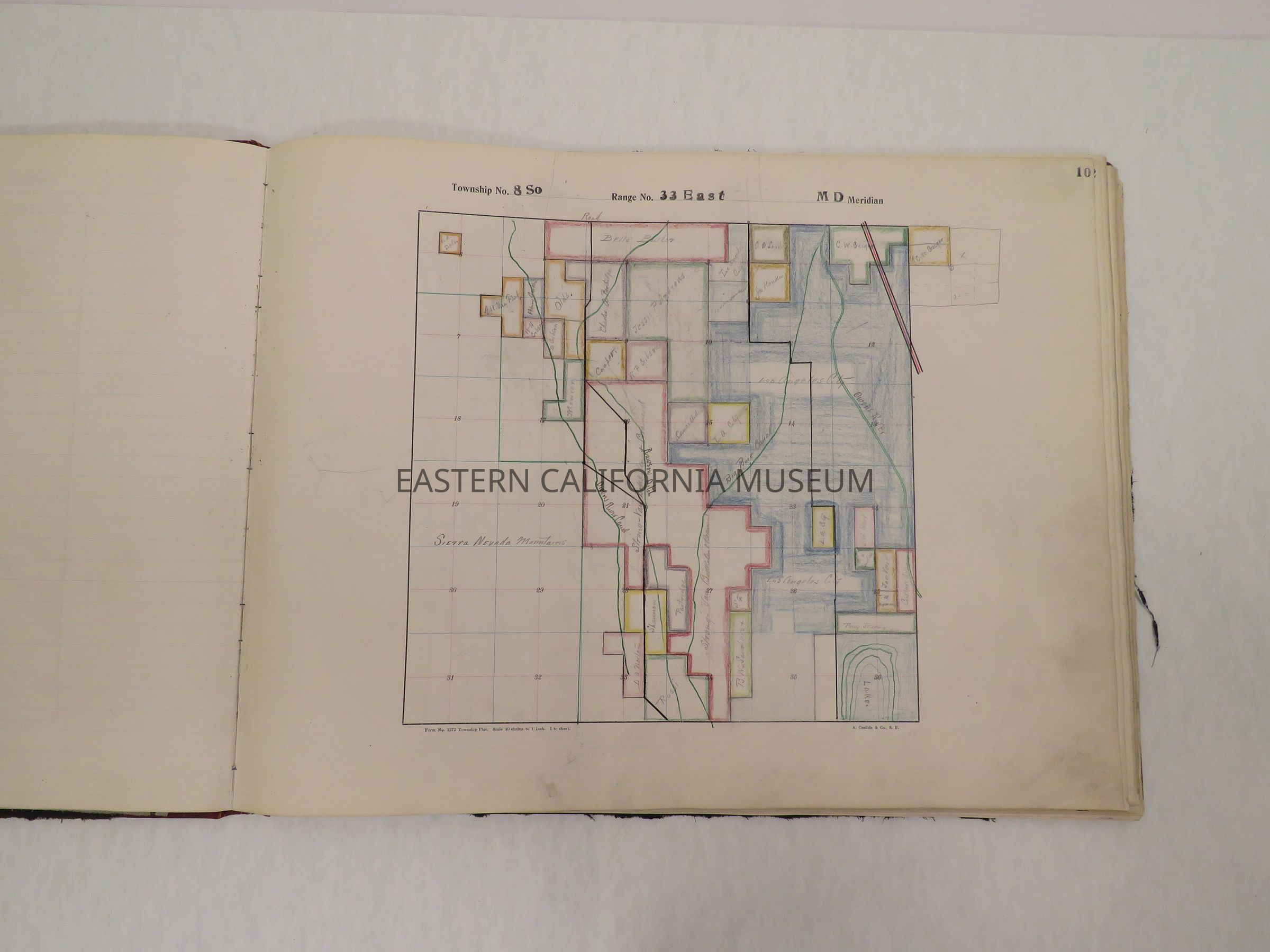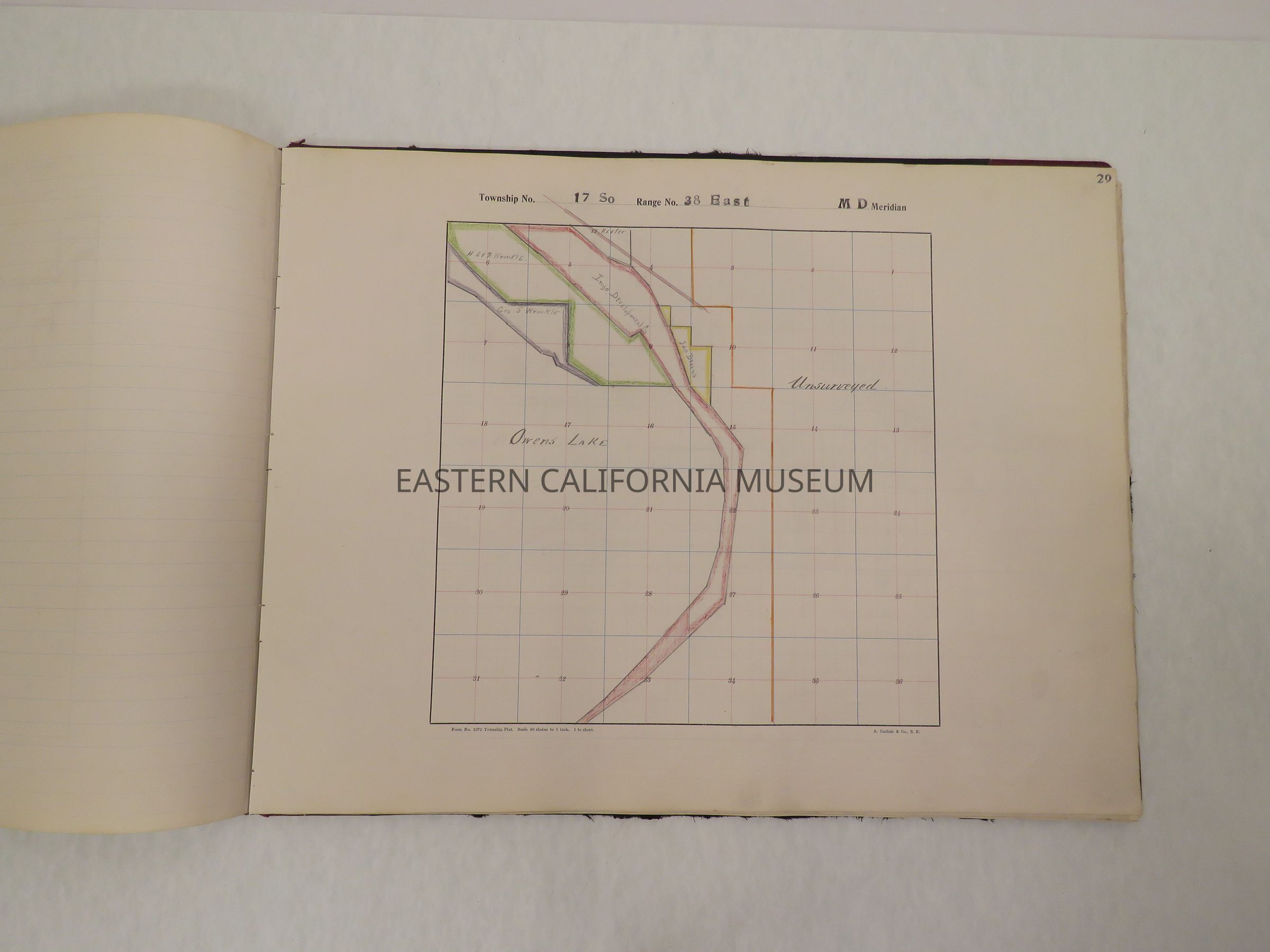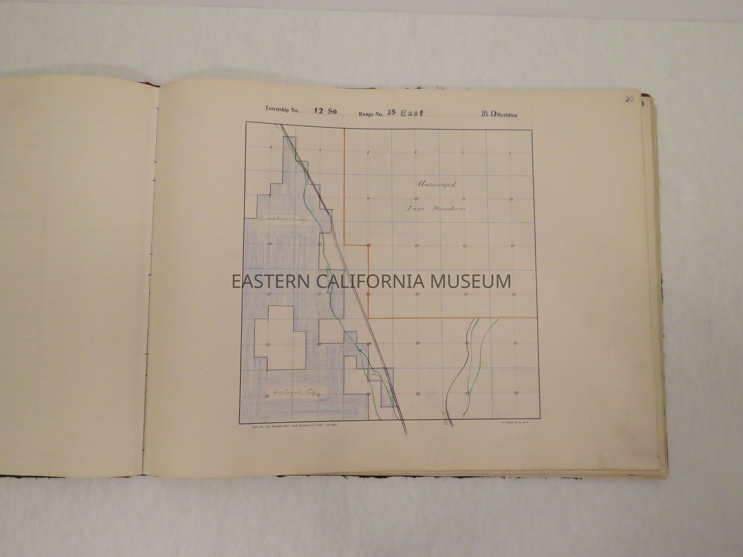 Bound plat map book showing land ownership from Bishop to Olancha and Keeler, c.1920s (there are many City of Los Angeles holdings). Inside front cover is written "Plat Book 3."