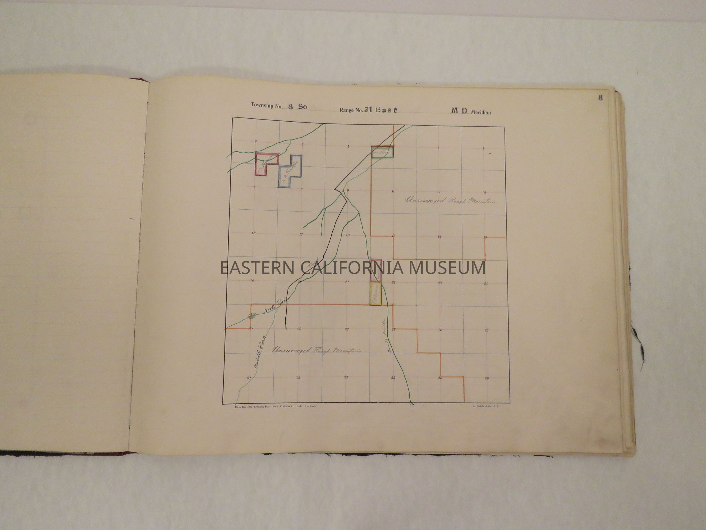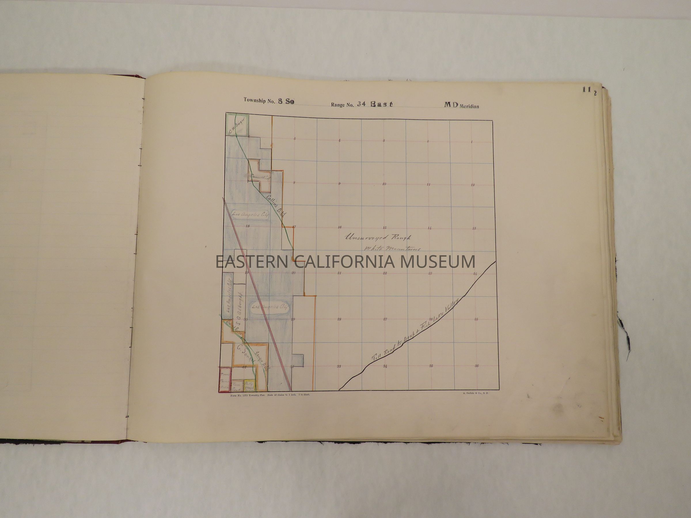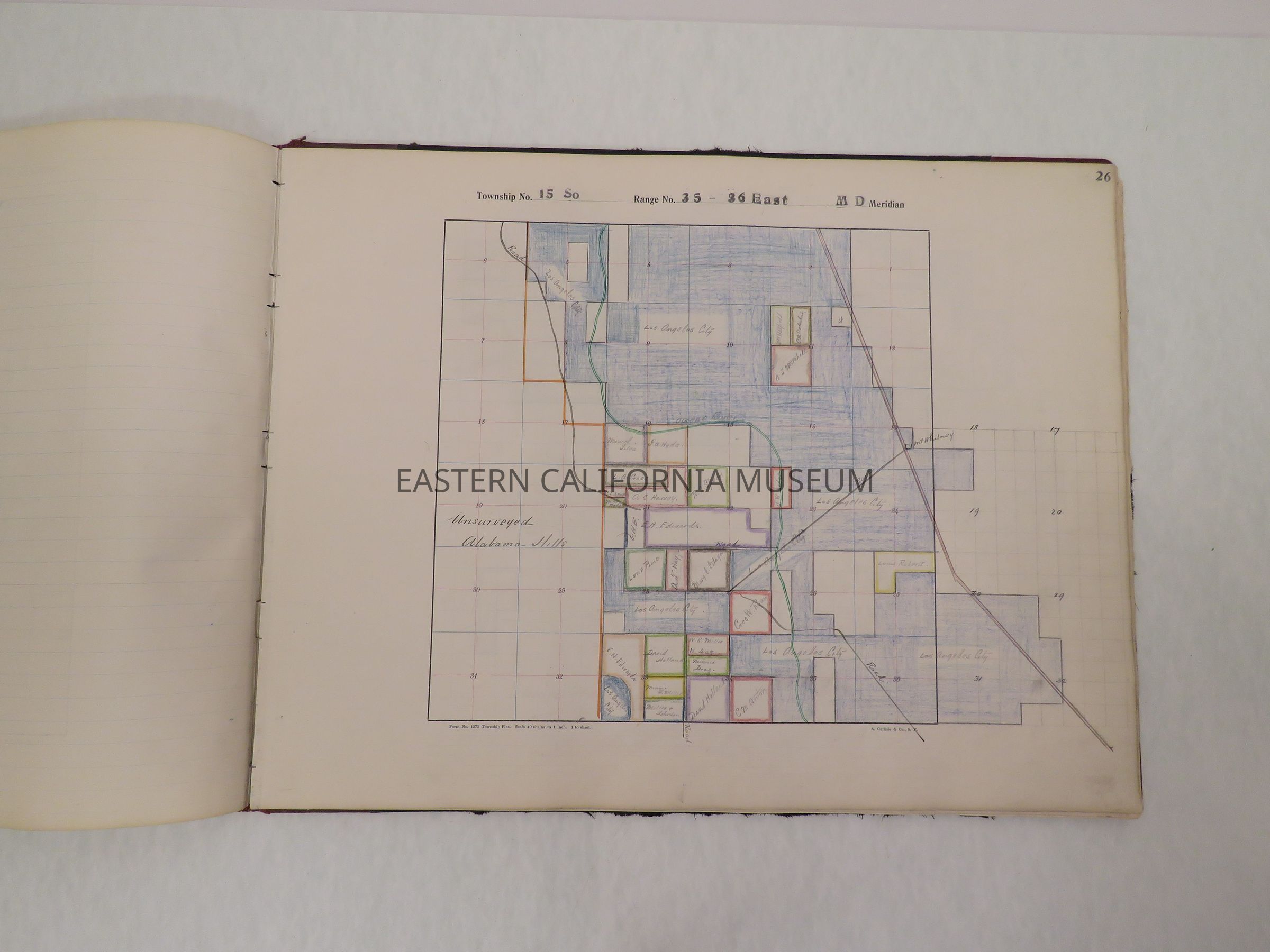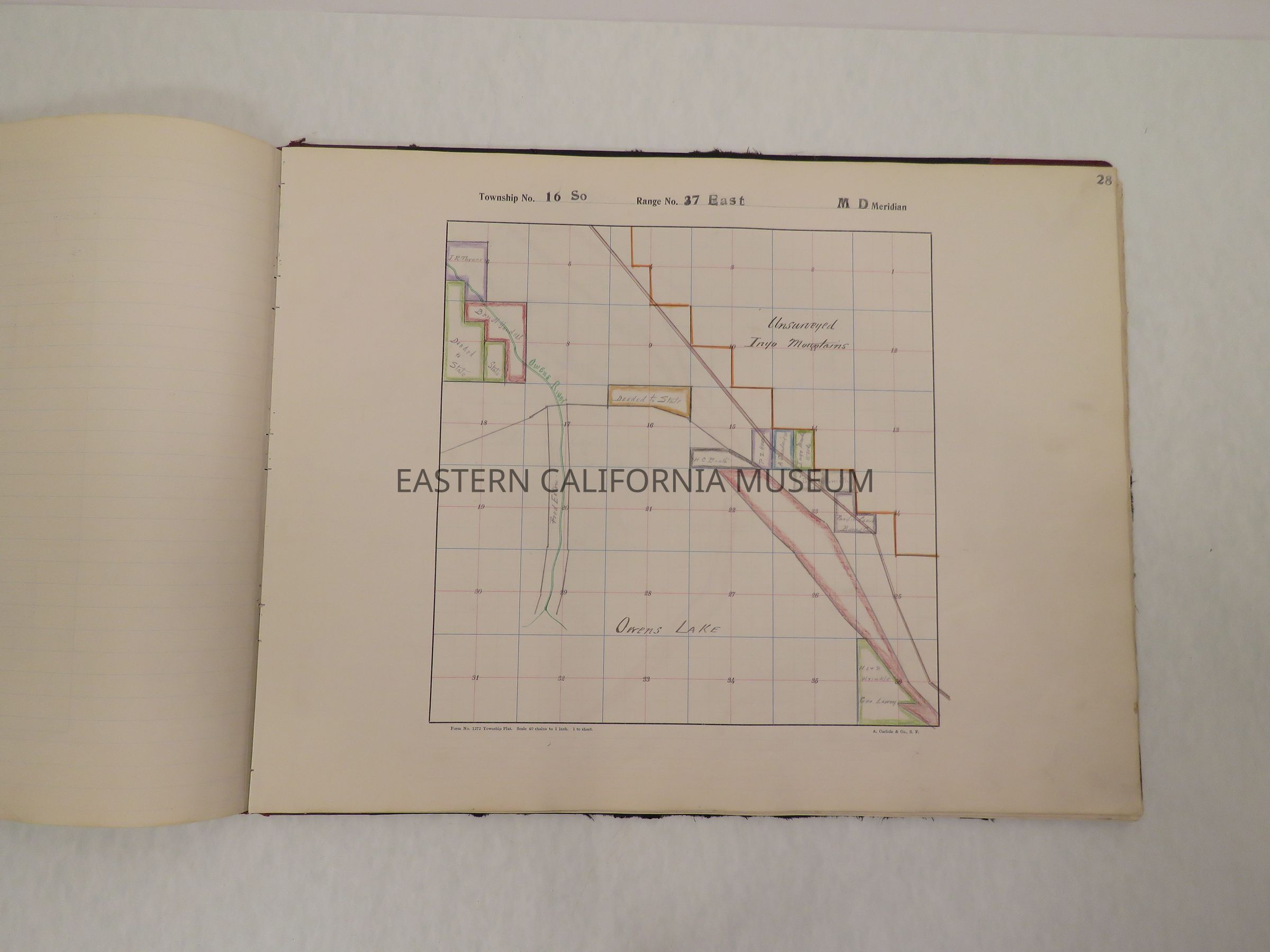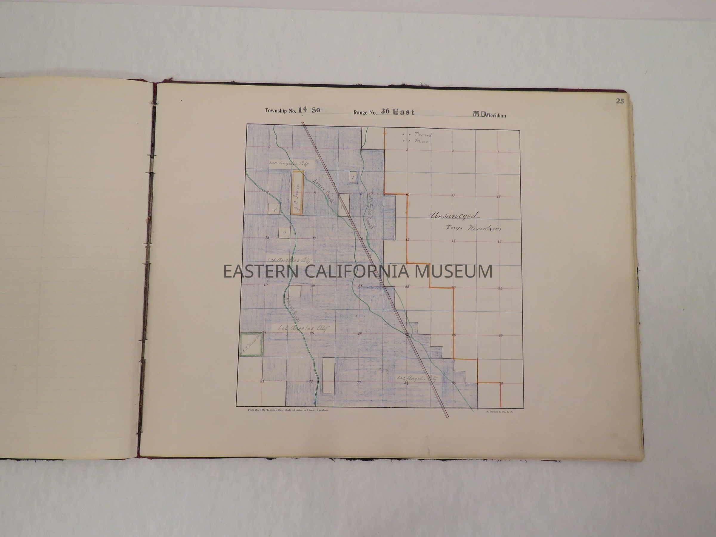 Bound plat map book showing land ownership from Bishop to Olancha and Keeler, c.1920s (there are many City of Los Angeles holdings). Inside front cover is written "Plat Book 3."
