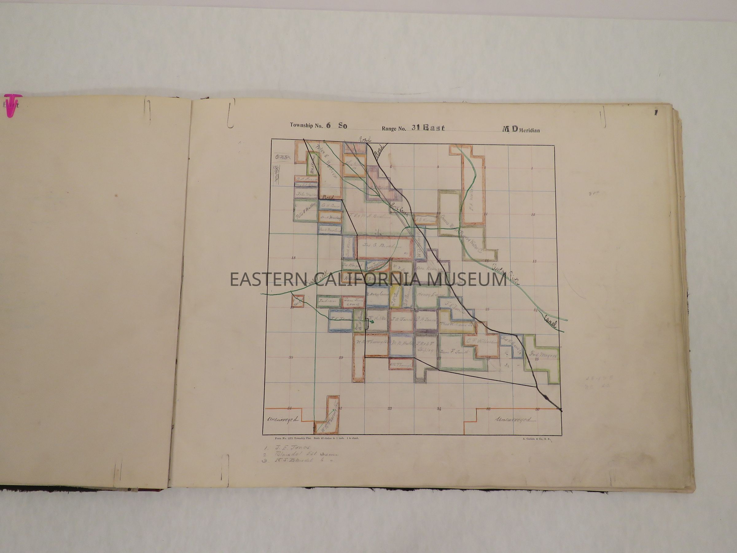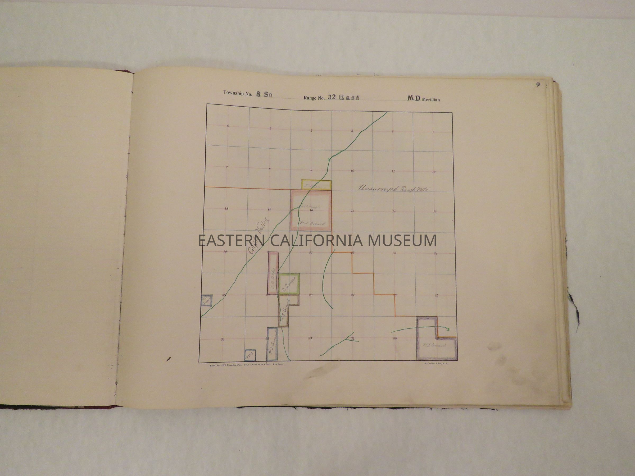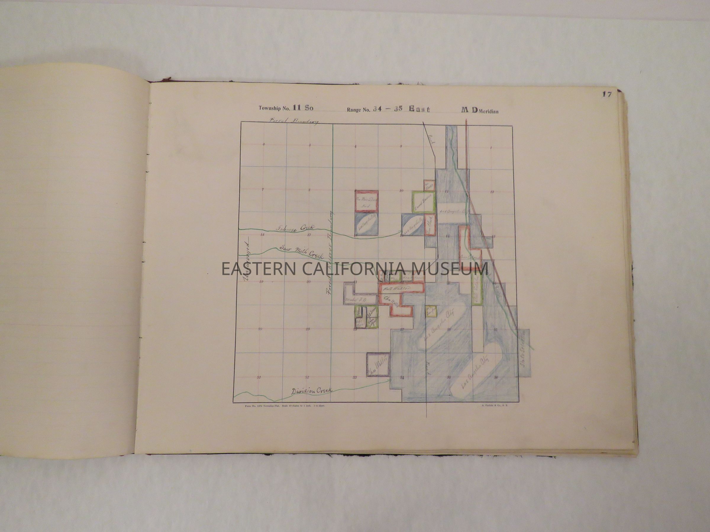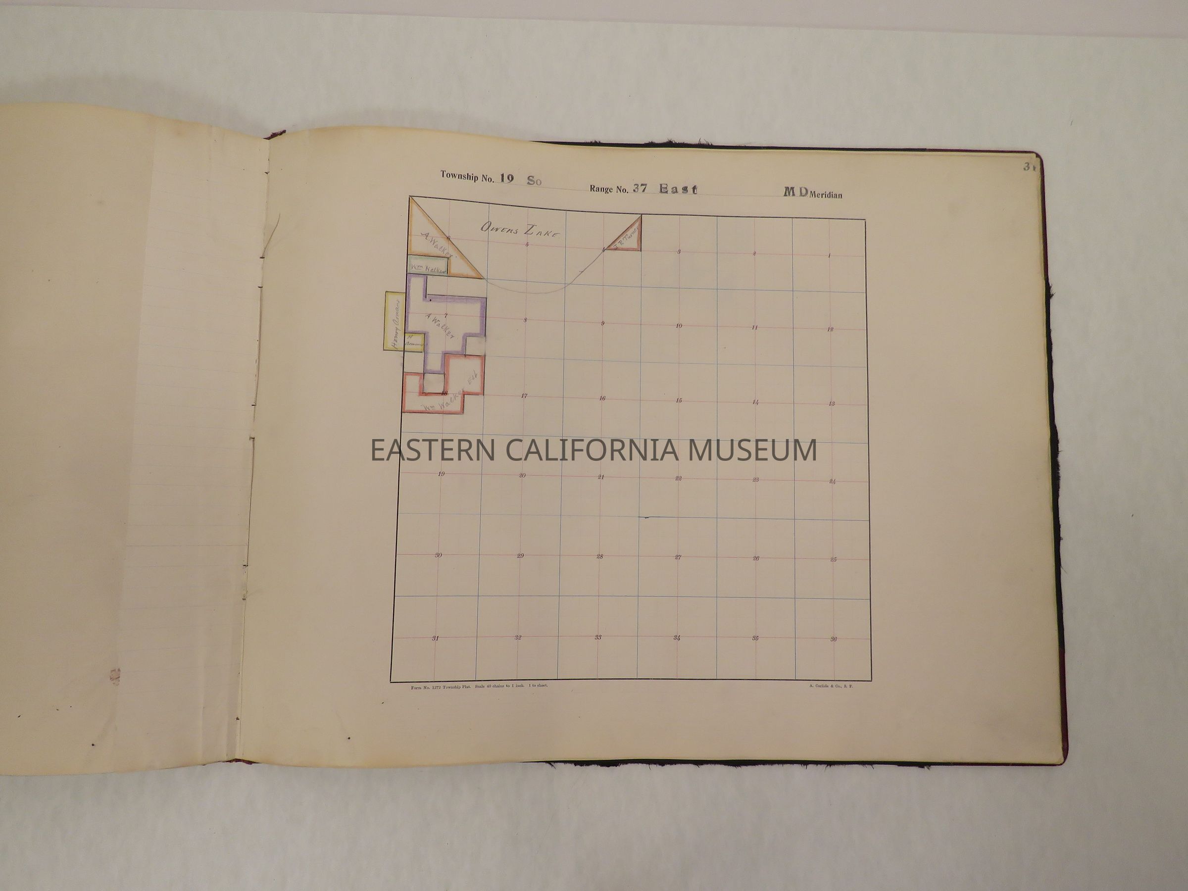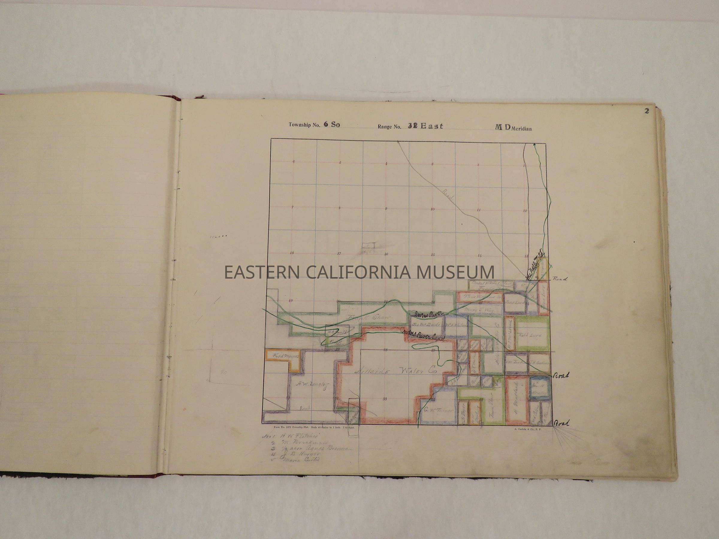 Bound plat map book showing land ownership from Bishop to Olancha and Keeler, c.1920s (there are many City of Los Angeles holdings). Inside front cover is written "Plat Book 3."