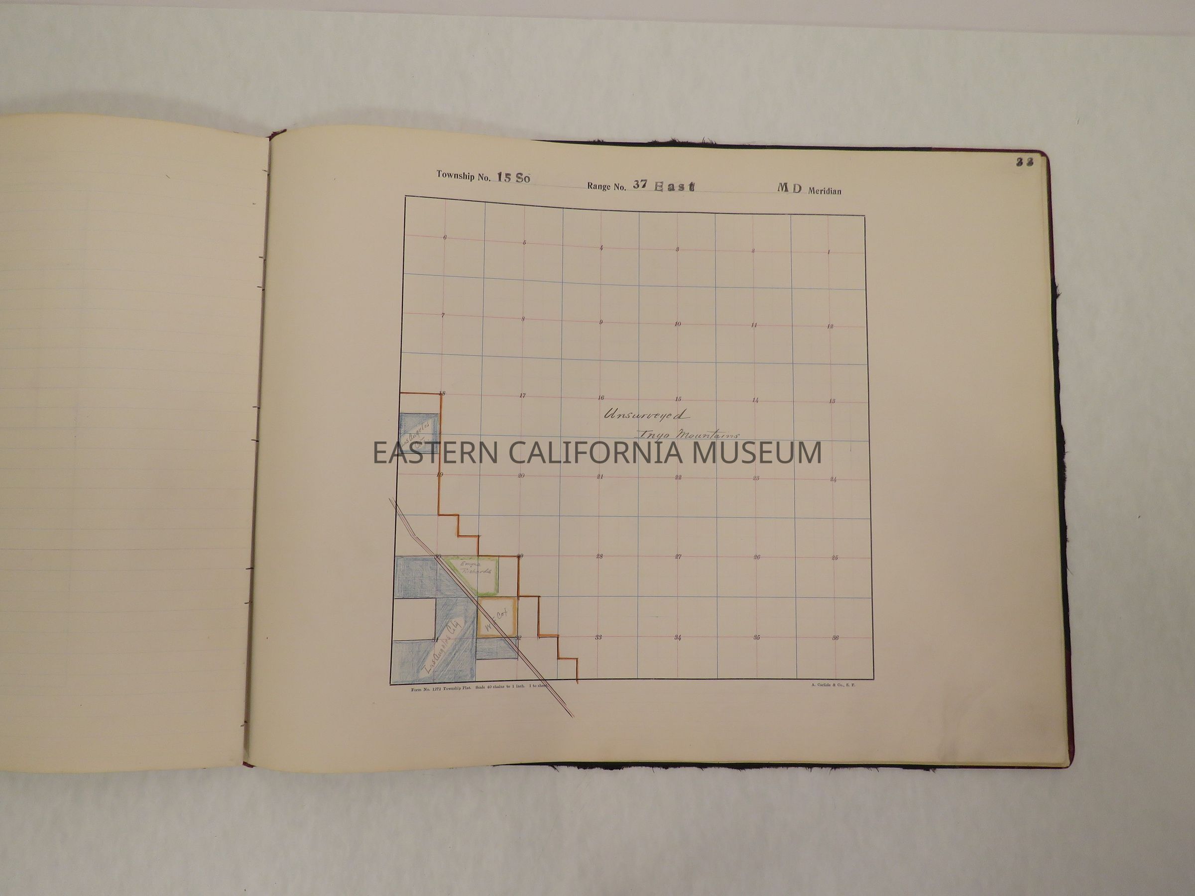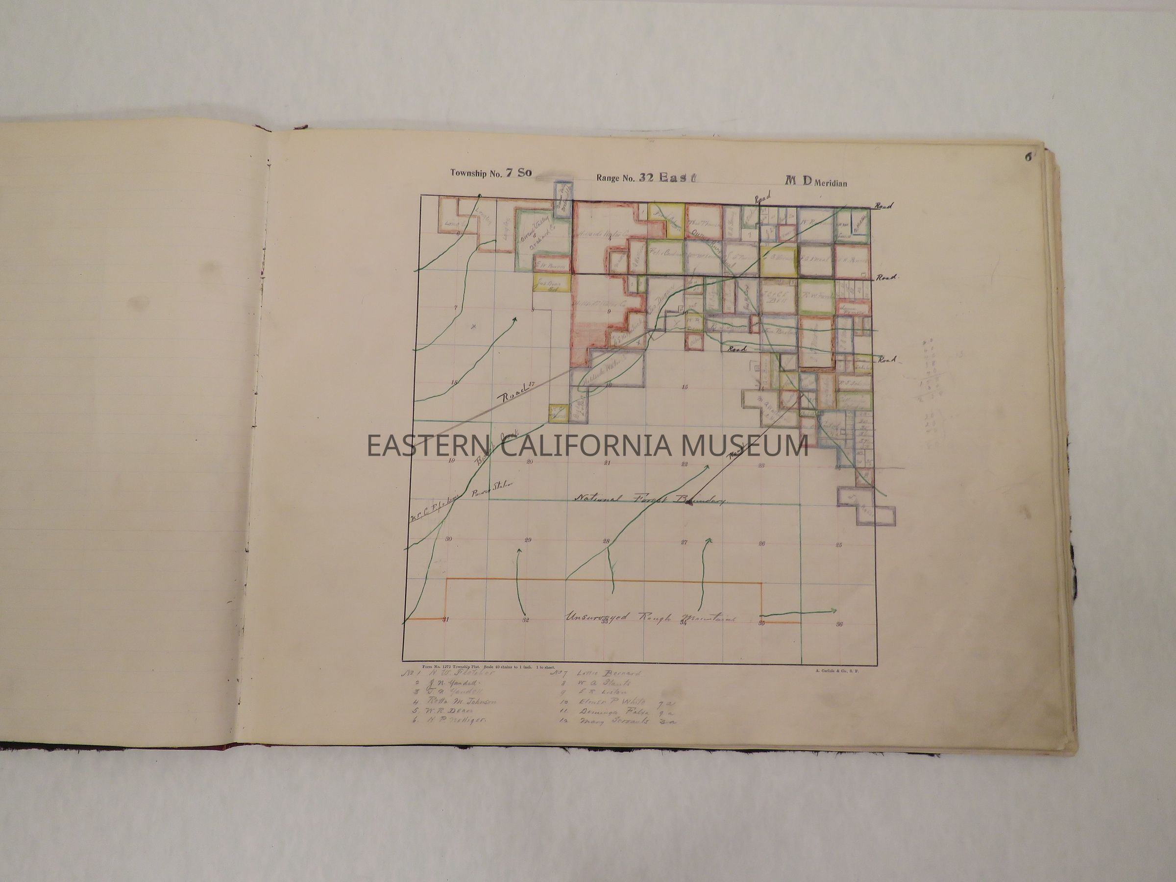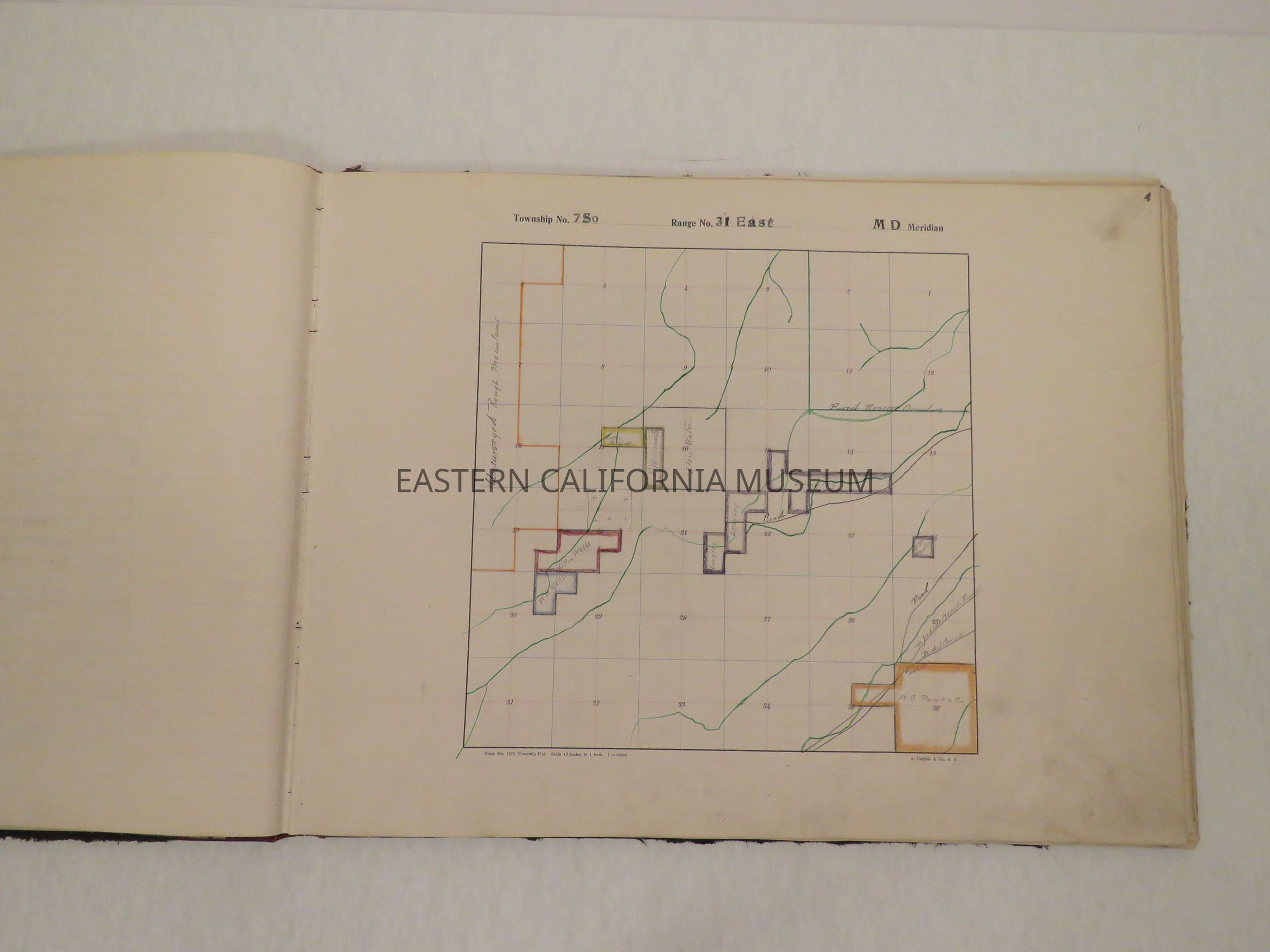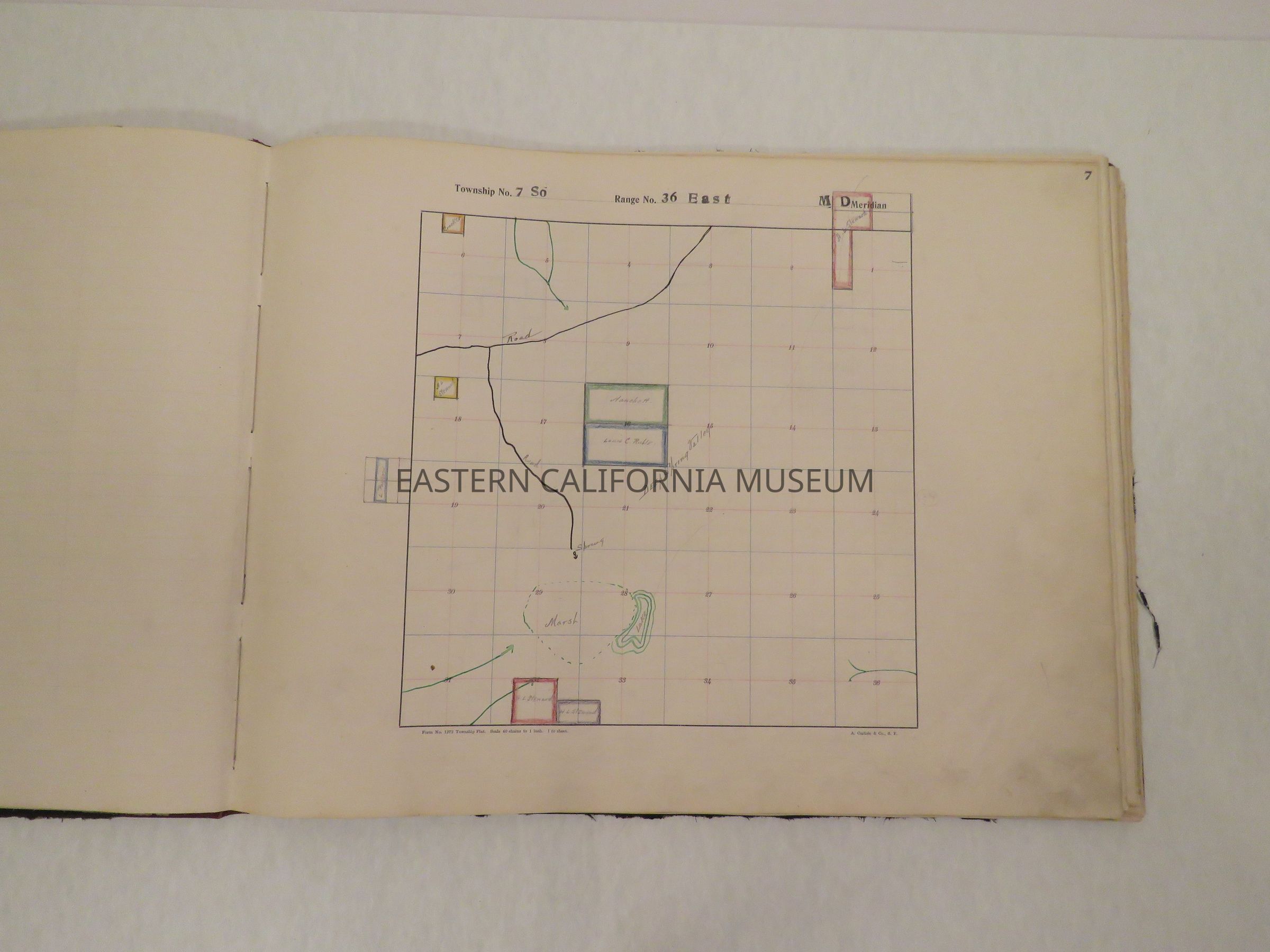 Bound plat map book showing land ownership from Bishop to Olancha and Keeler, c.1920s (there are many City of Los Angeles holdings). Inside front cover is written "Plat Book 3."