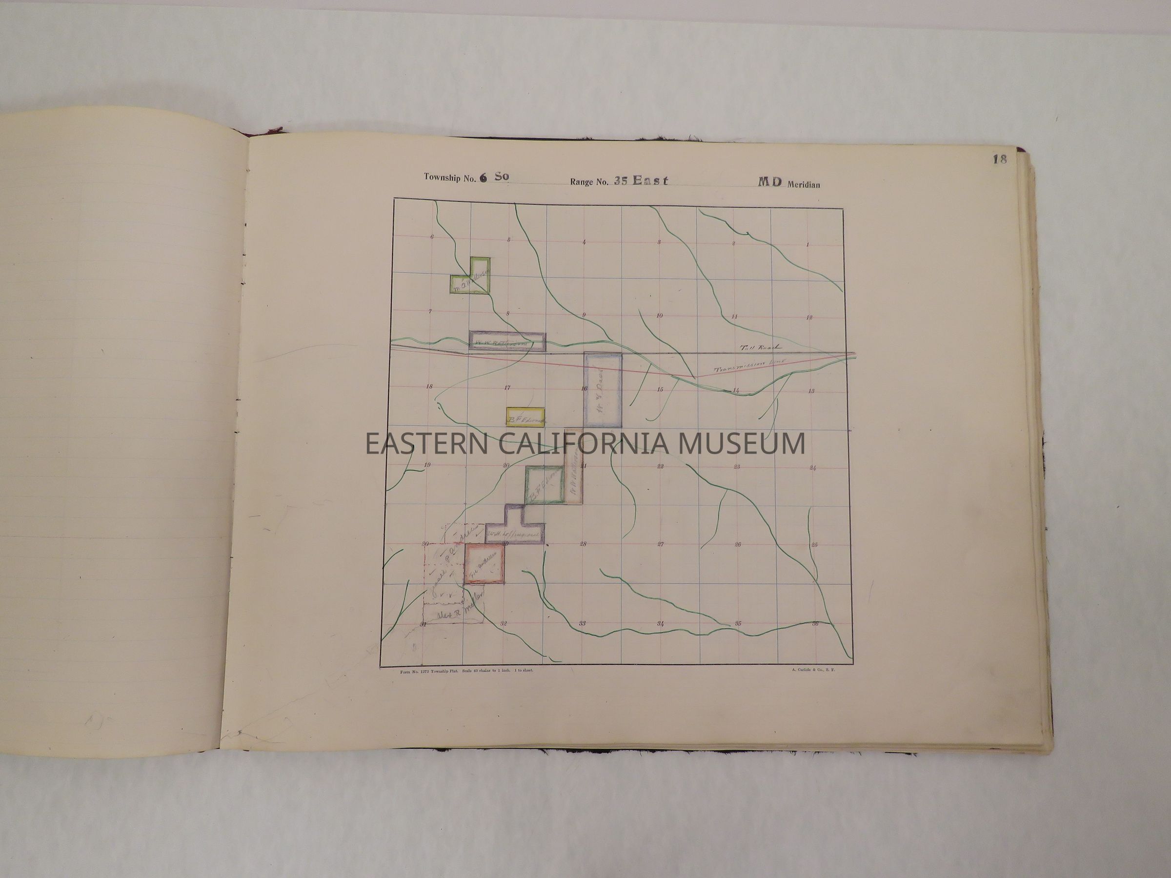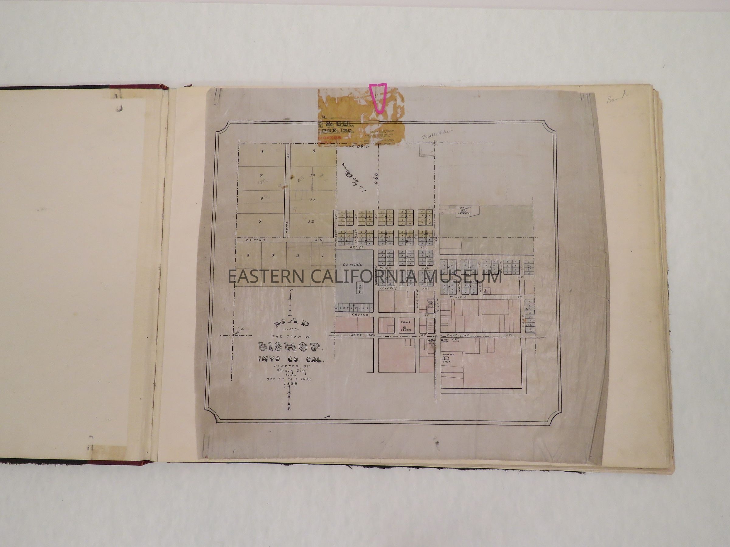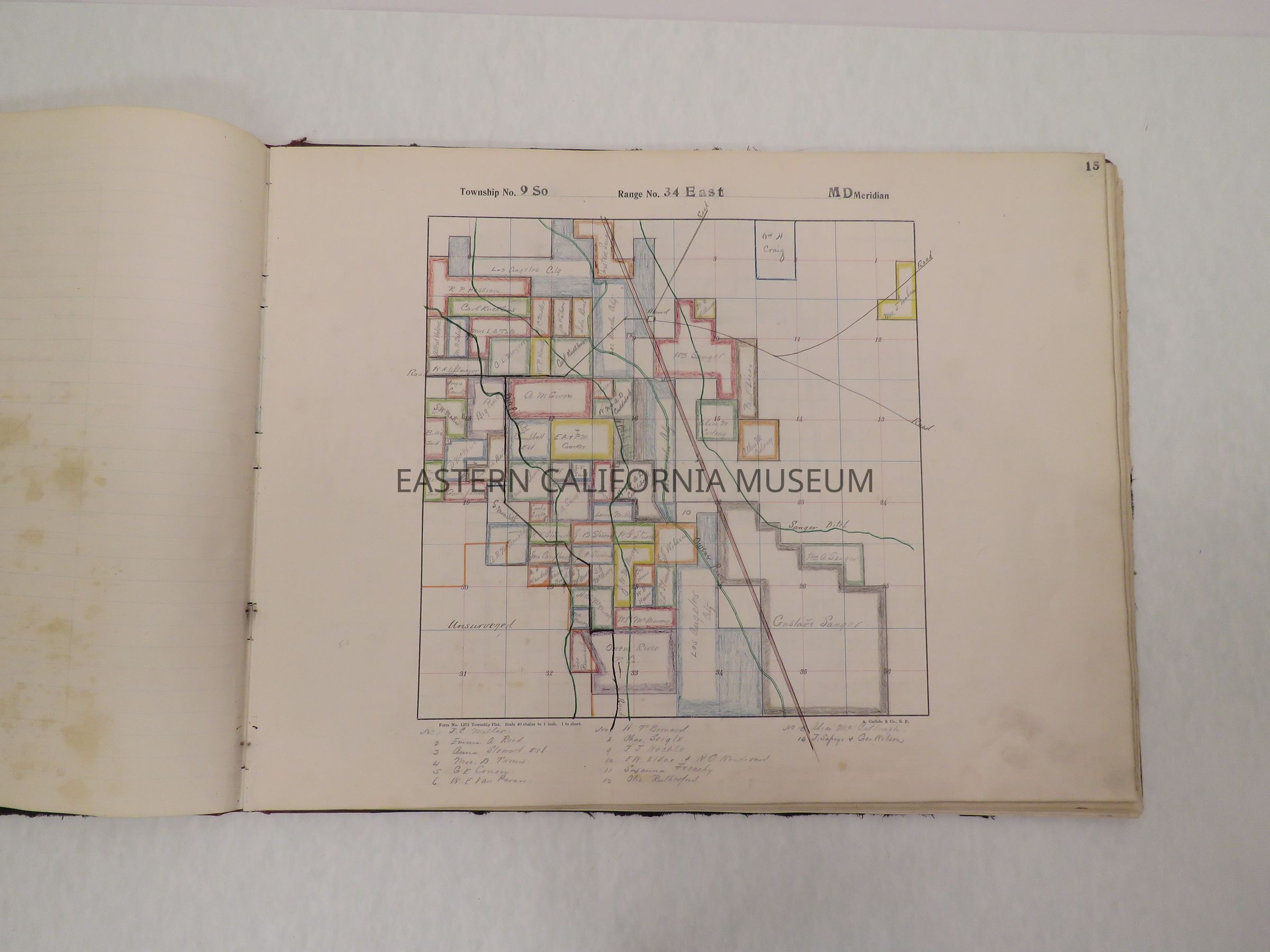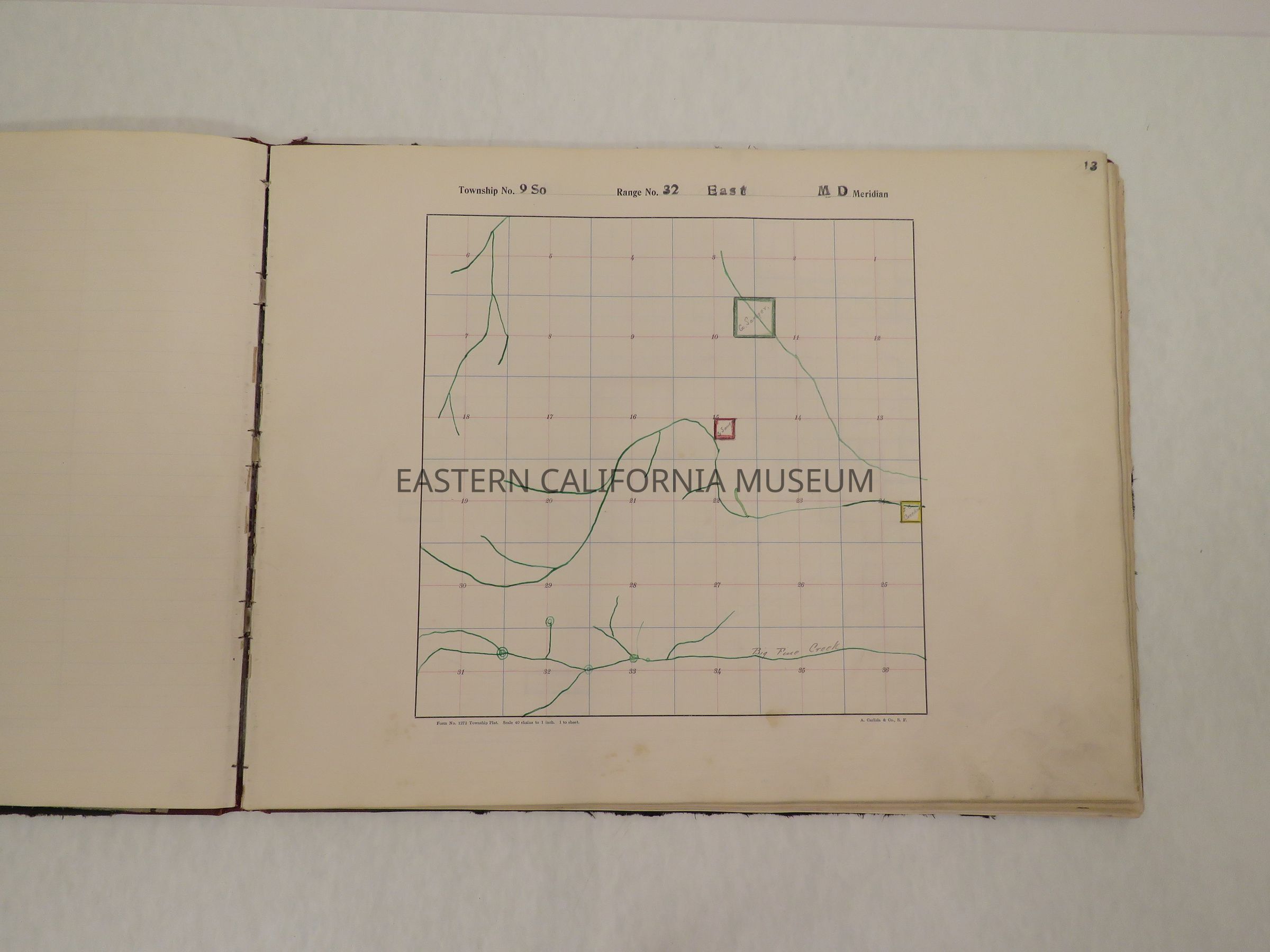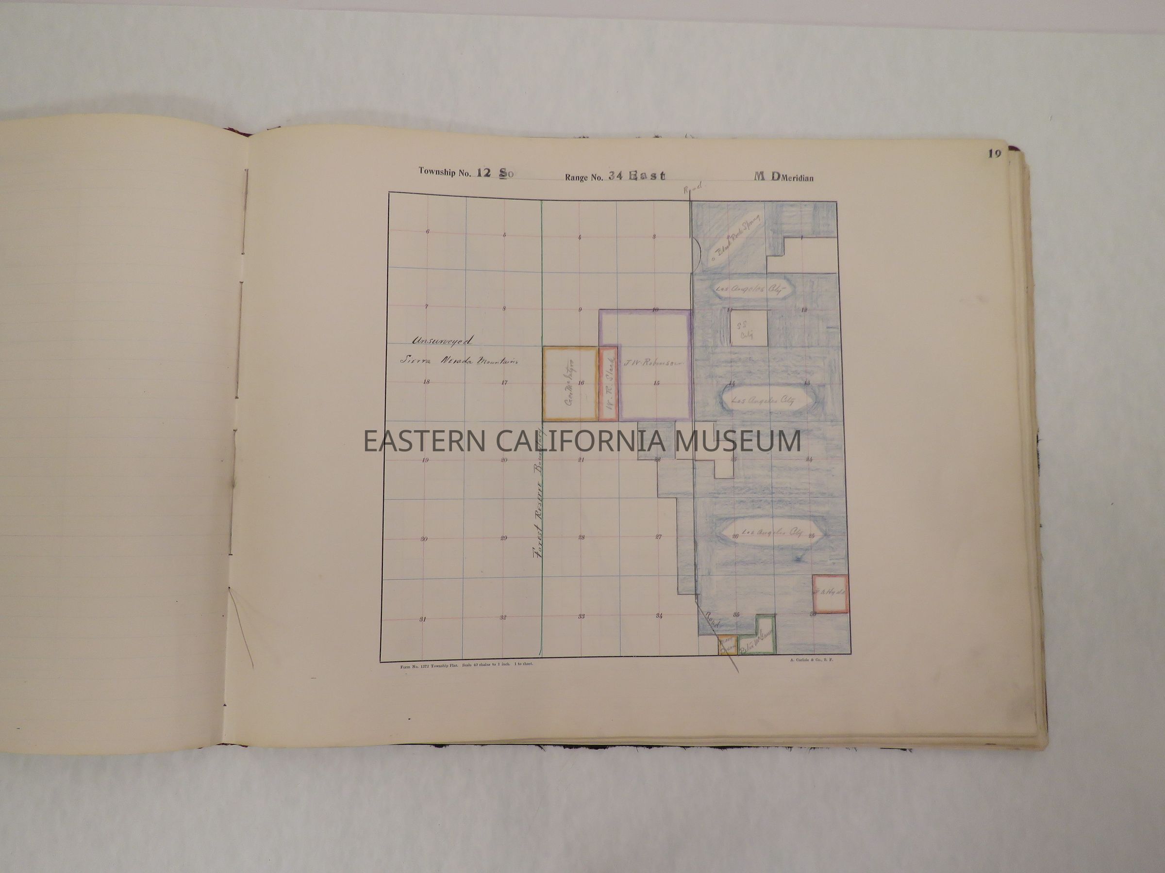 Bound plat map book showing land ownership from Bishop to Olancha and Keeler, c.1920s (there are many City of Los Angeles holdings). Inside front cover is written "Plat Book 3."