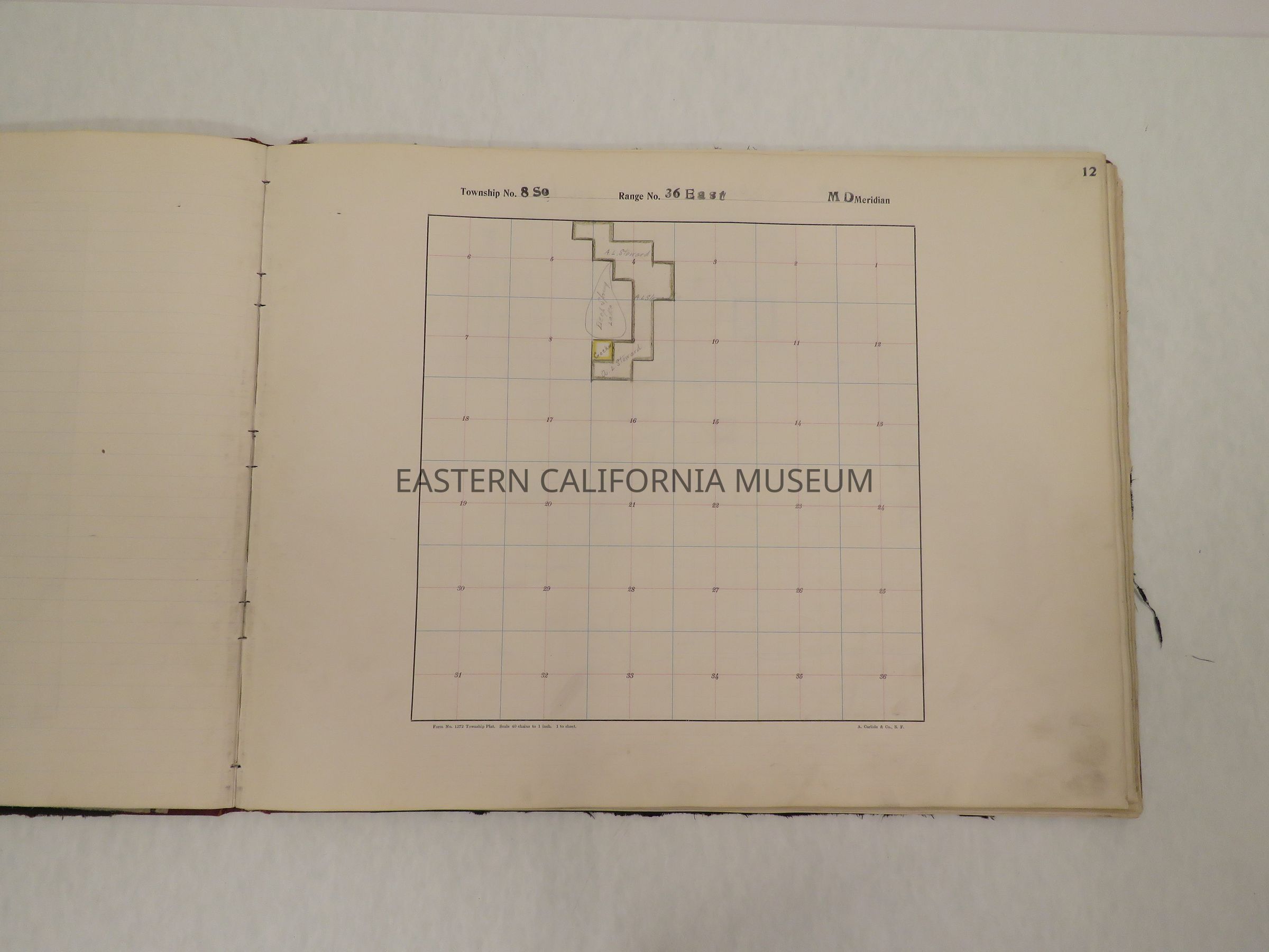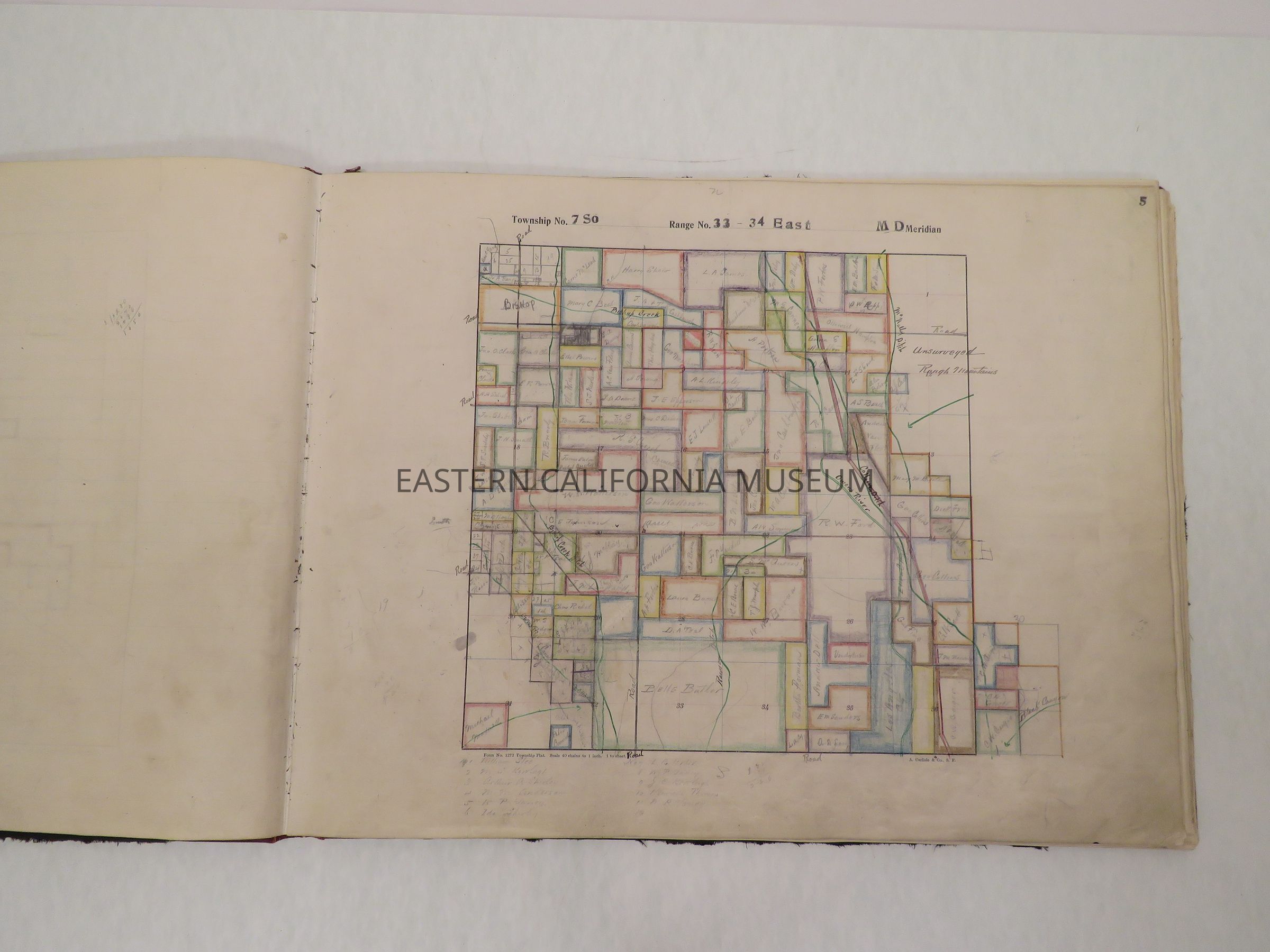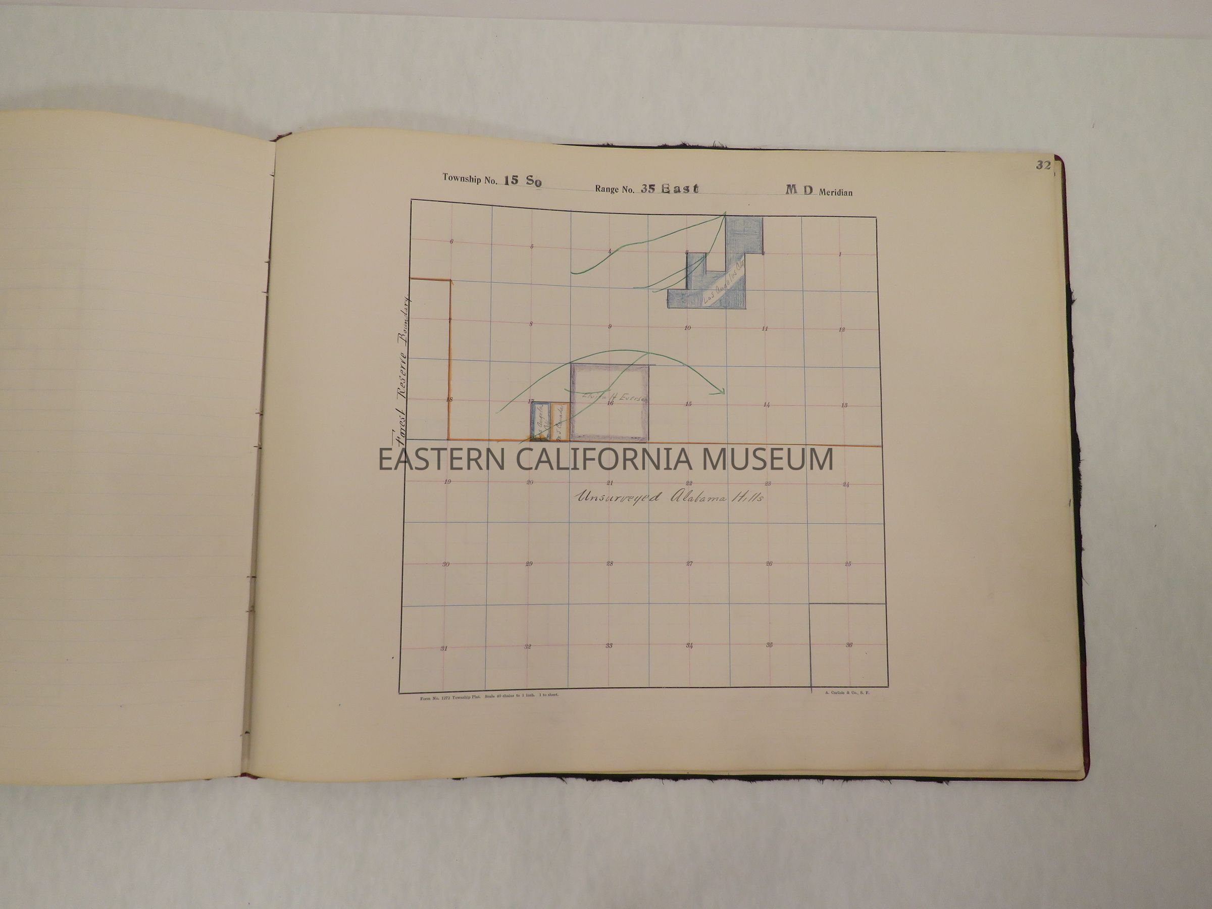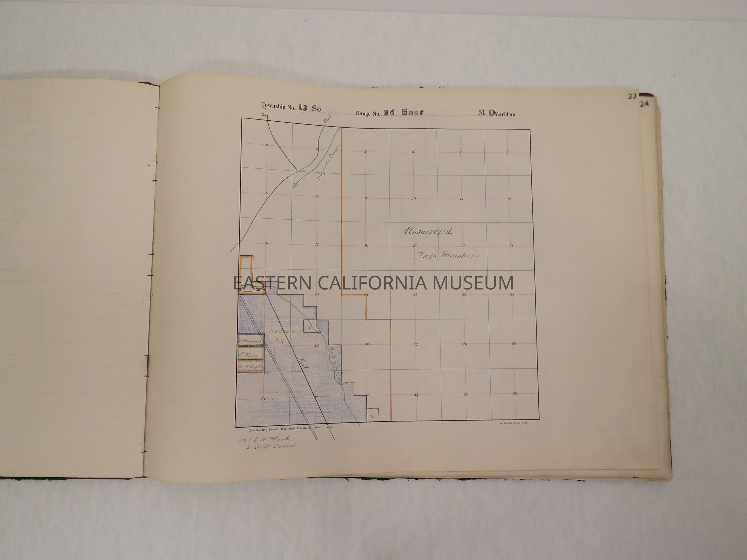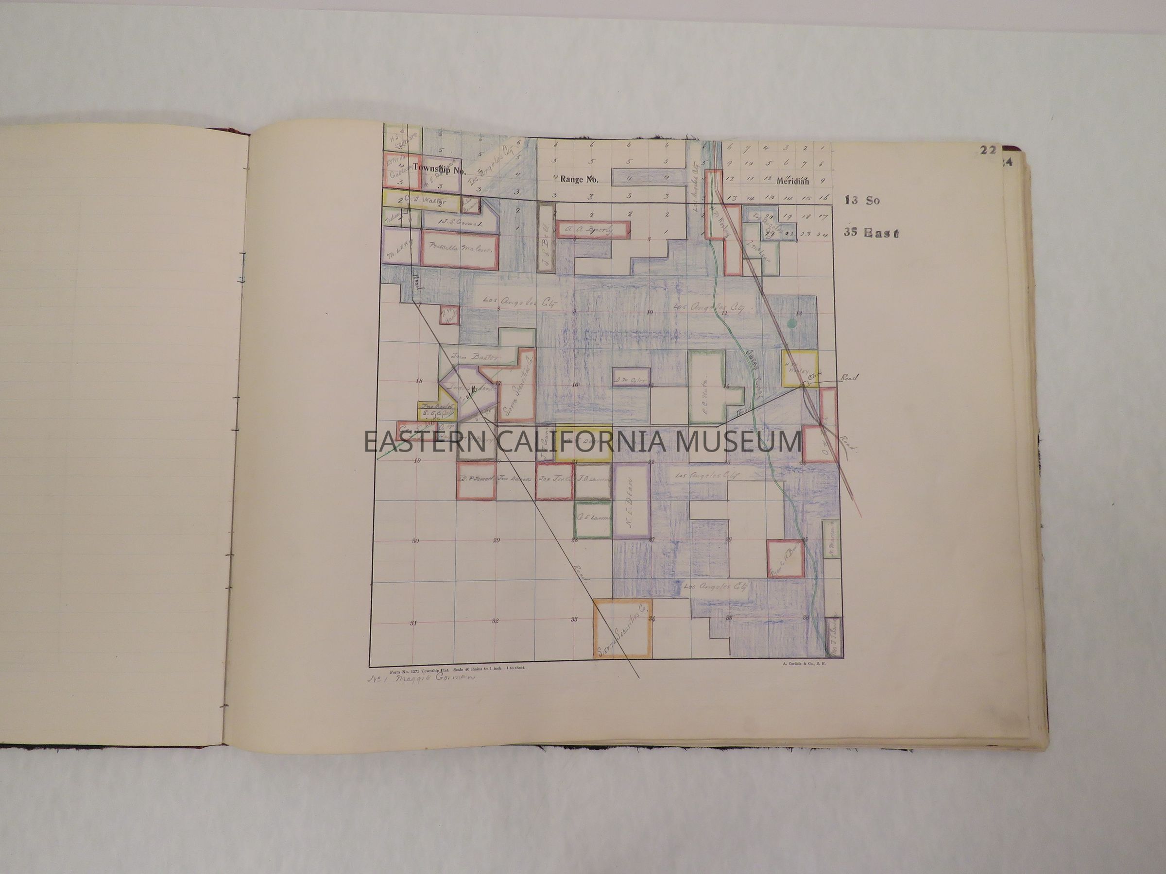 Bound plat map book showing land ownership from Bishop to Olancha and Keeler, c.1920s (there are many City of Los Angeles holdings). Inside front cover is written "Plat Book 3."