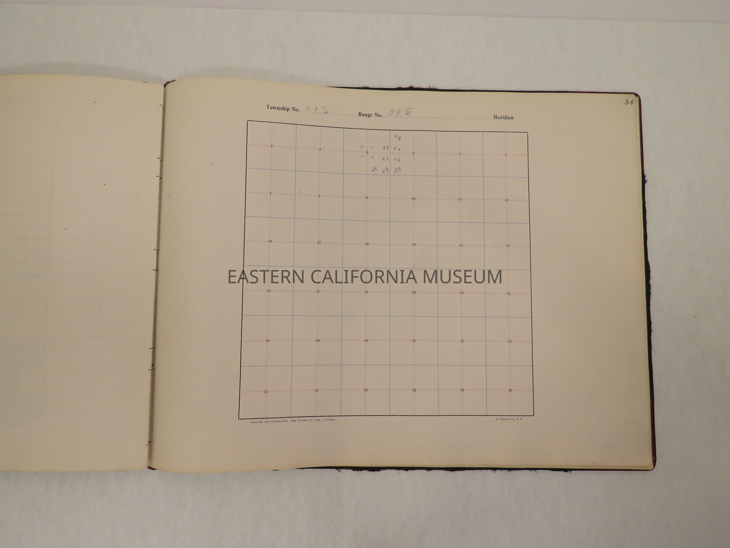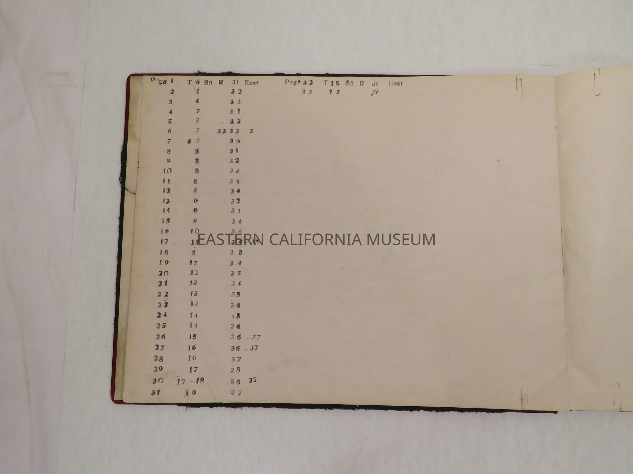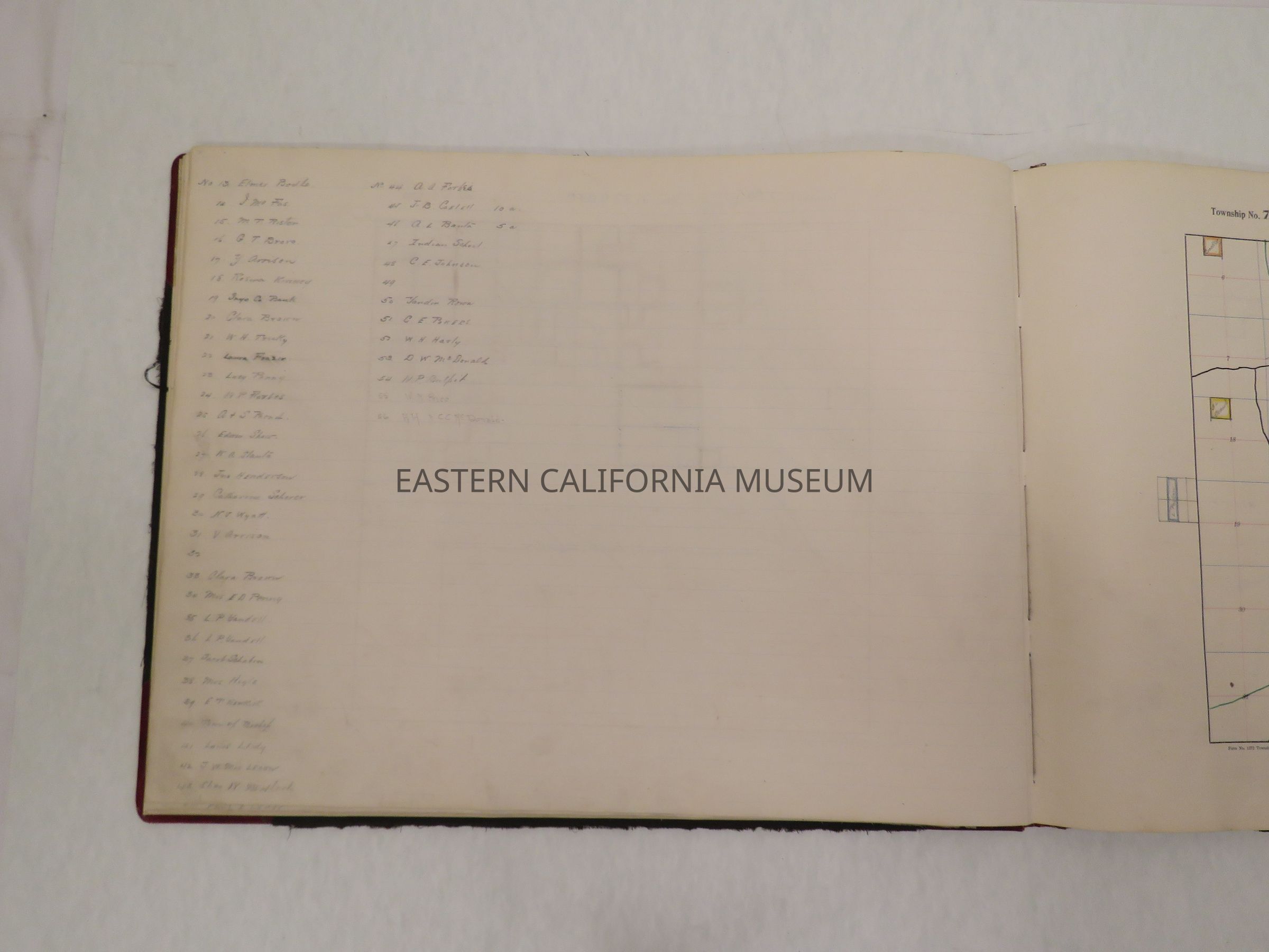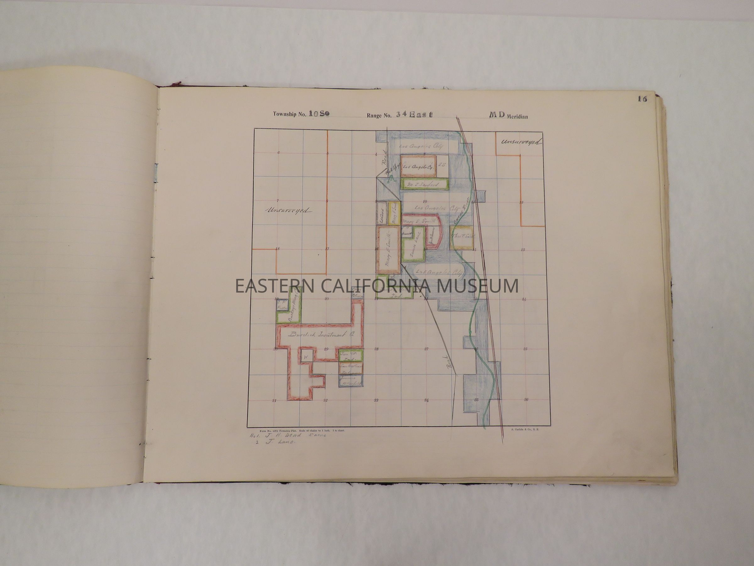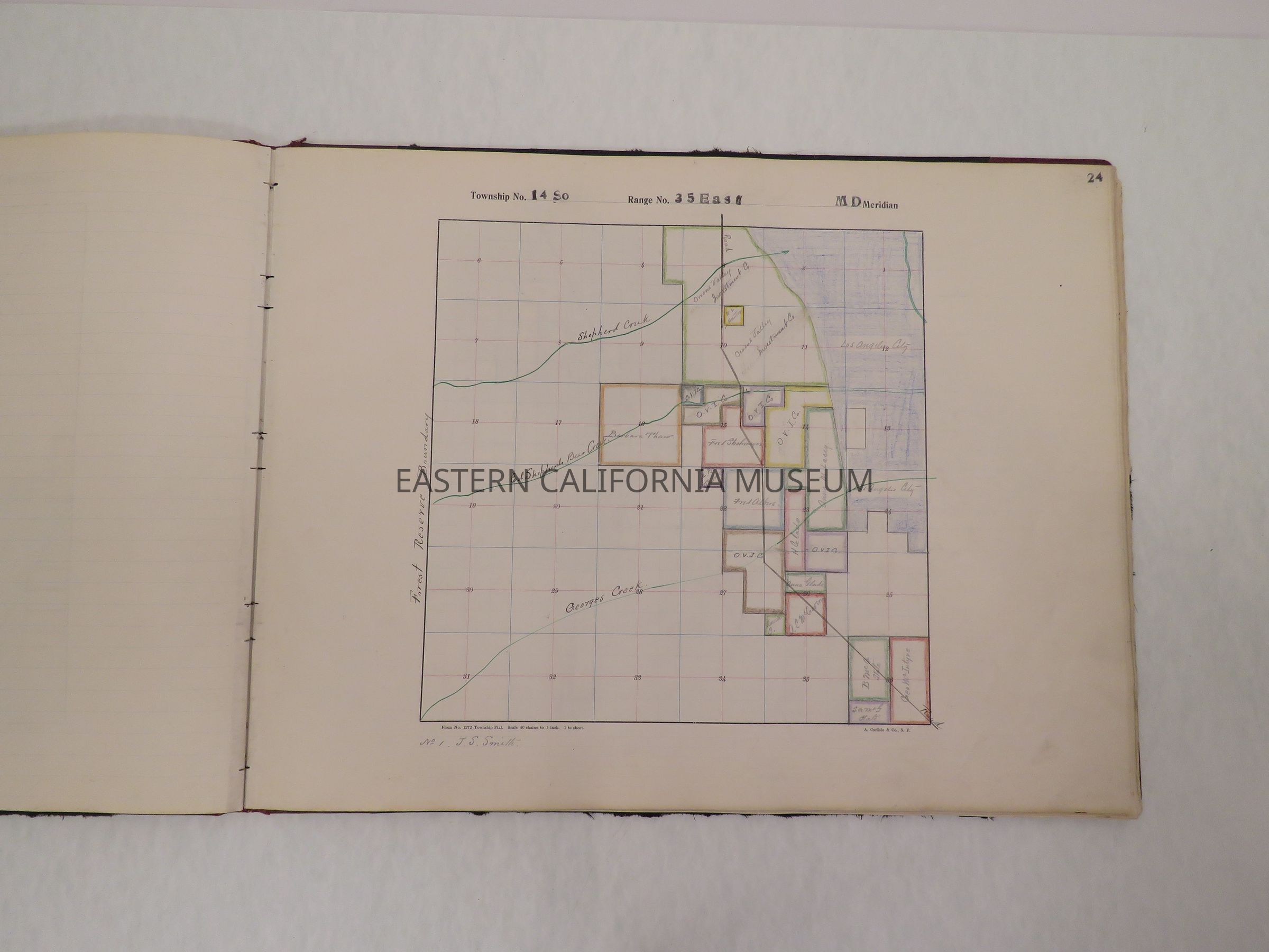 Bound plat map book showing land ownership from Bishop to Olancha and Keeler, c.1920s (there are many City of Los Angeles holdings). Inside front cover is written "Plat Book 3."