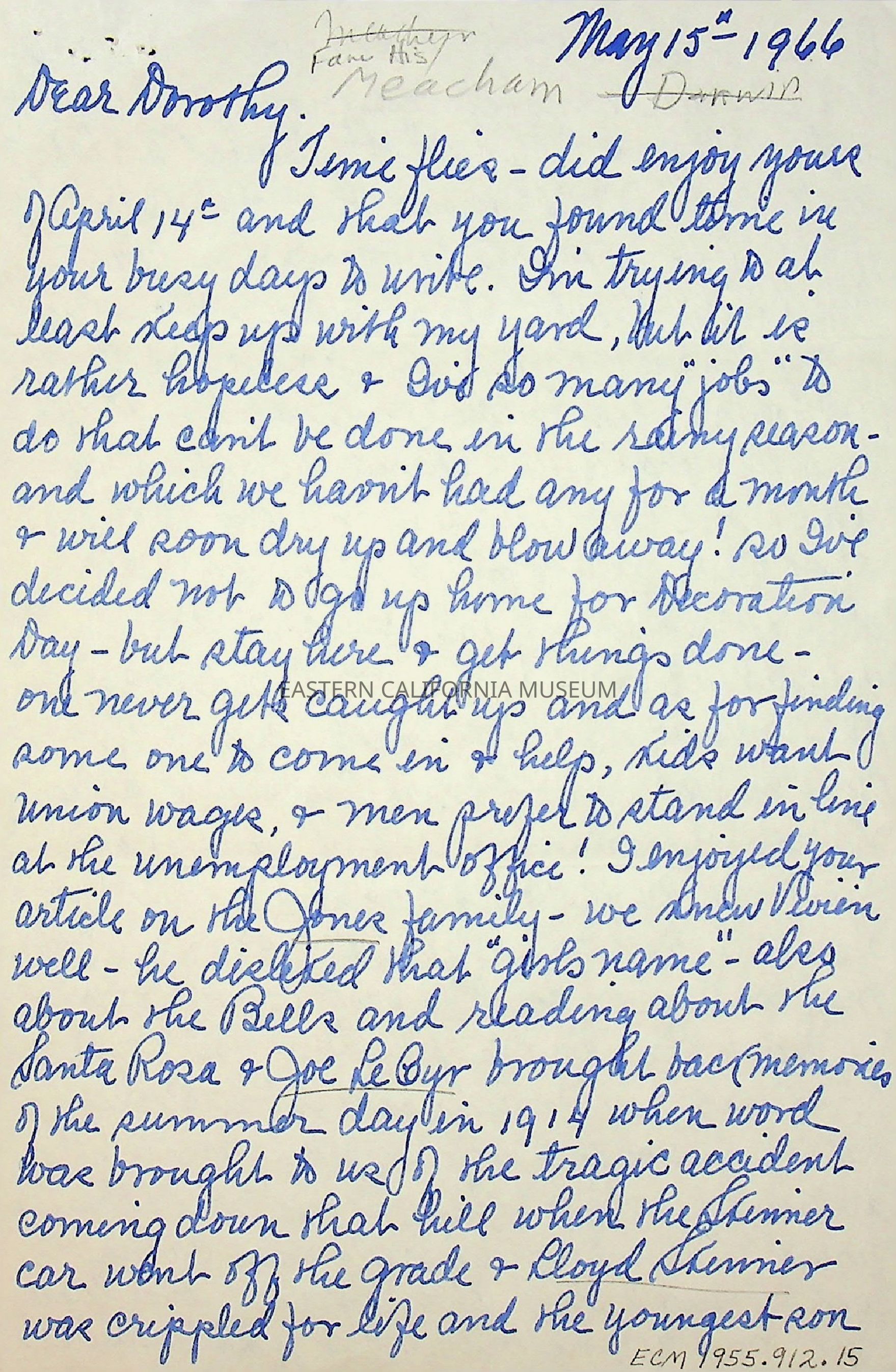 Three page, double sided letter from Elizabeth L. Mecham to Dorothy [Cragen] on 05/15/1966.