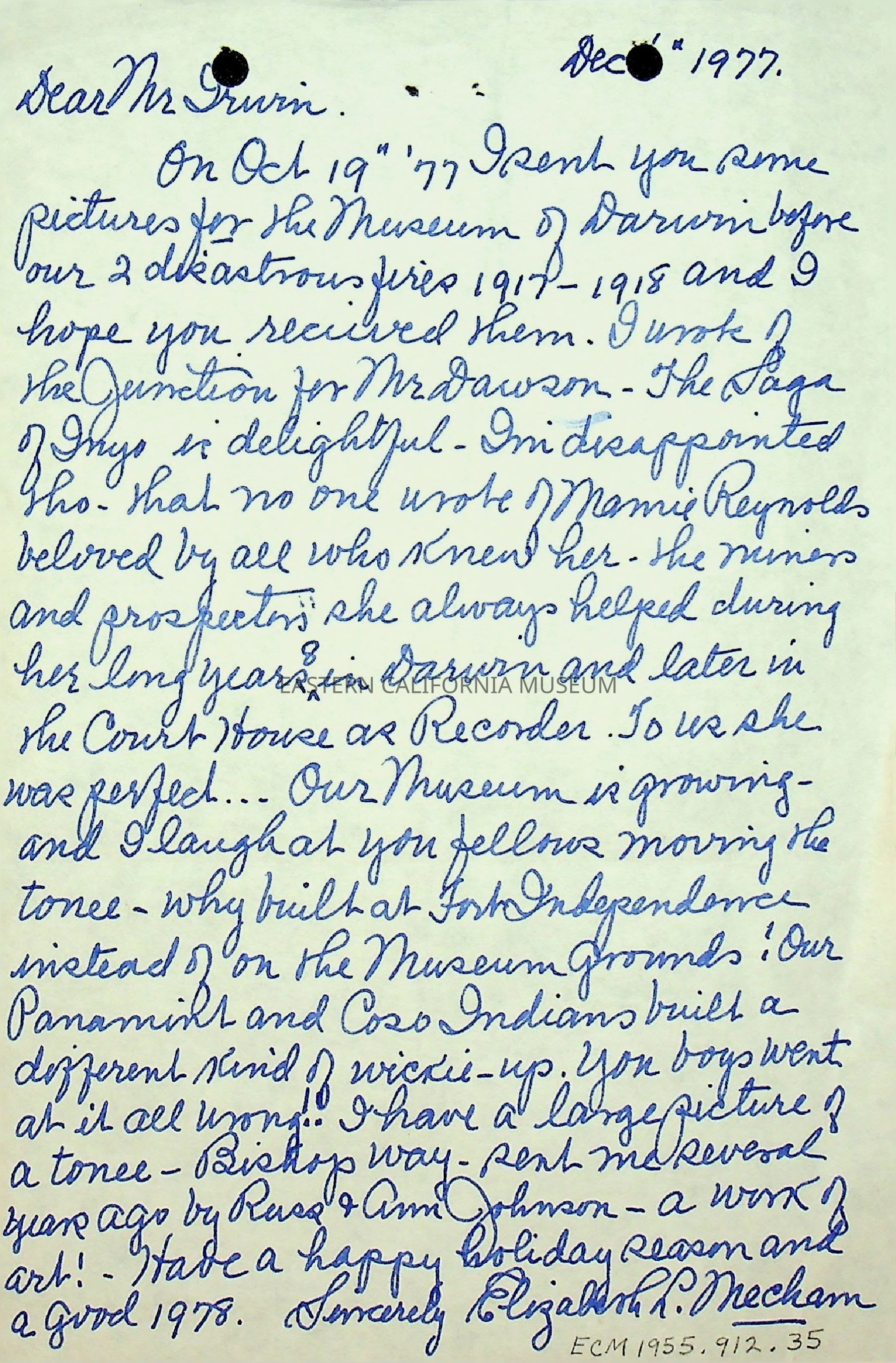 One page, single sided letter from Elizabeth L. Mecham to Mr. [Charles] Irwin on 12/06/1977.