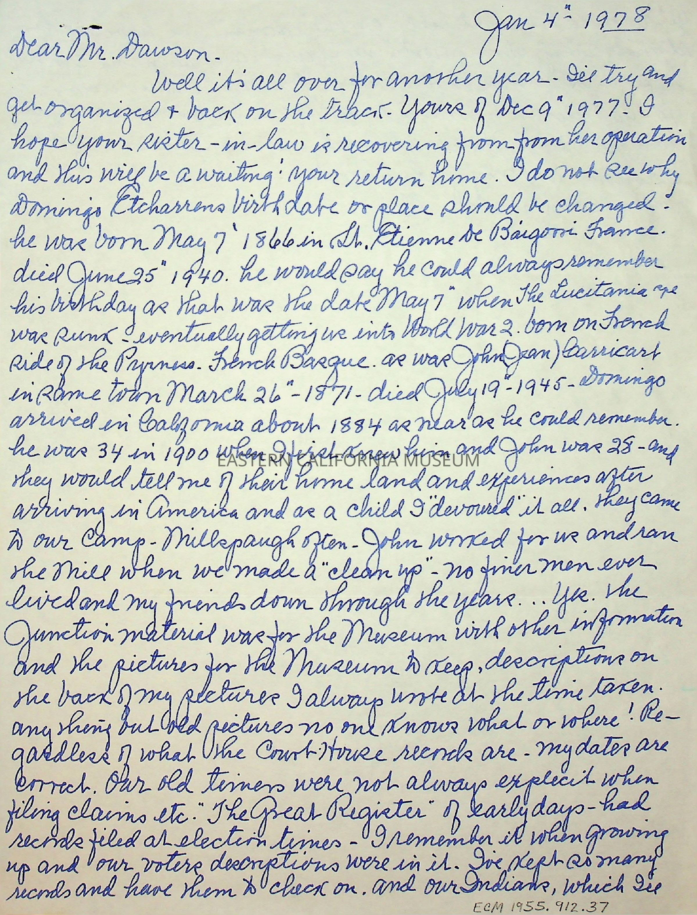 Five page, double sided letter from Elizabeth L. Mecham to [Burrell] Dawson on 01/04/1978. Has envelope with letter.