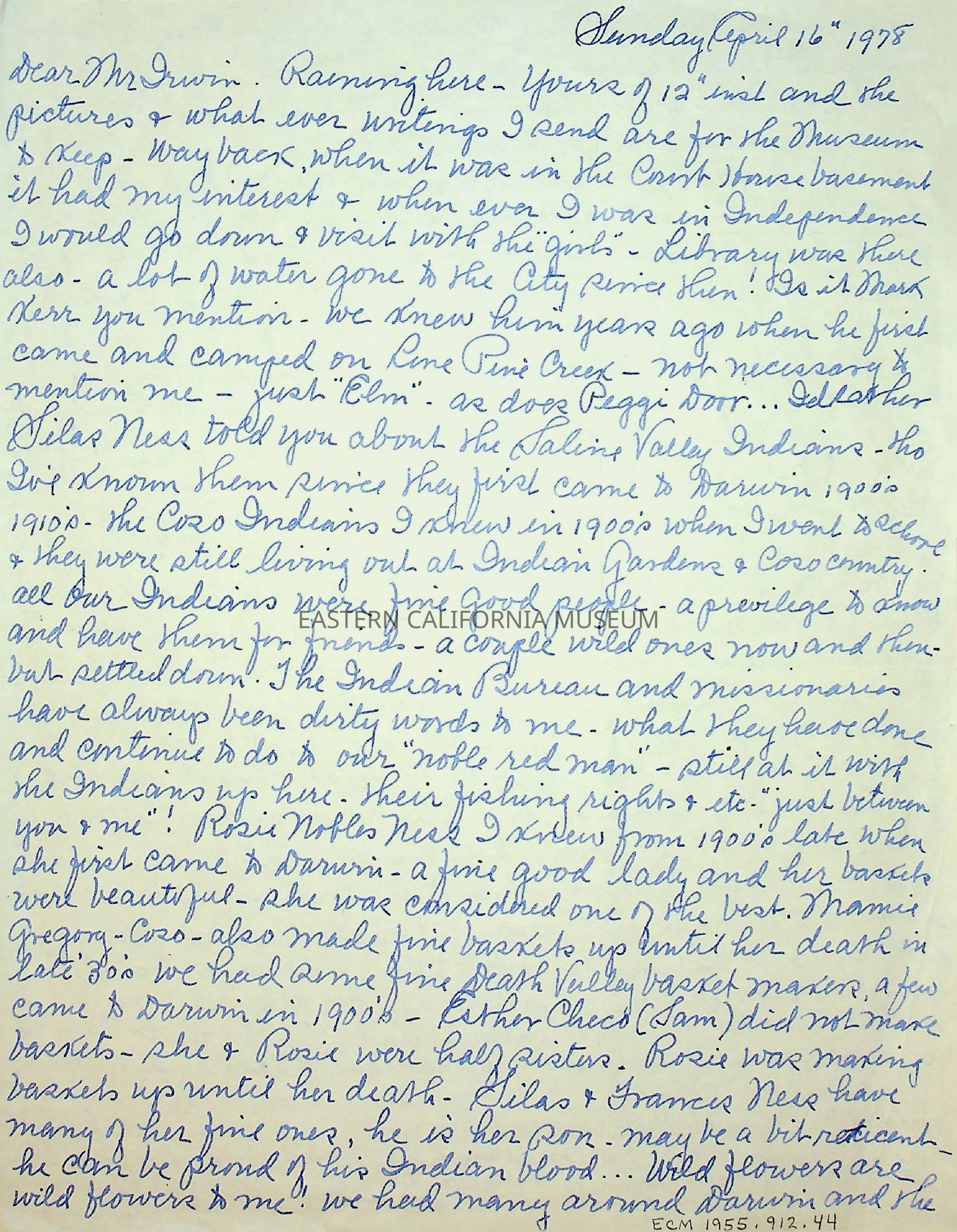 One page, double sided letter from Elizabeth L. Mecham to [Charles] Irwin on 04/16/1978.
