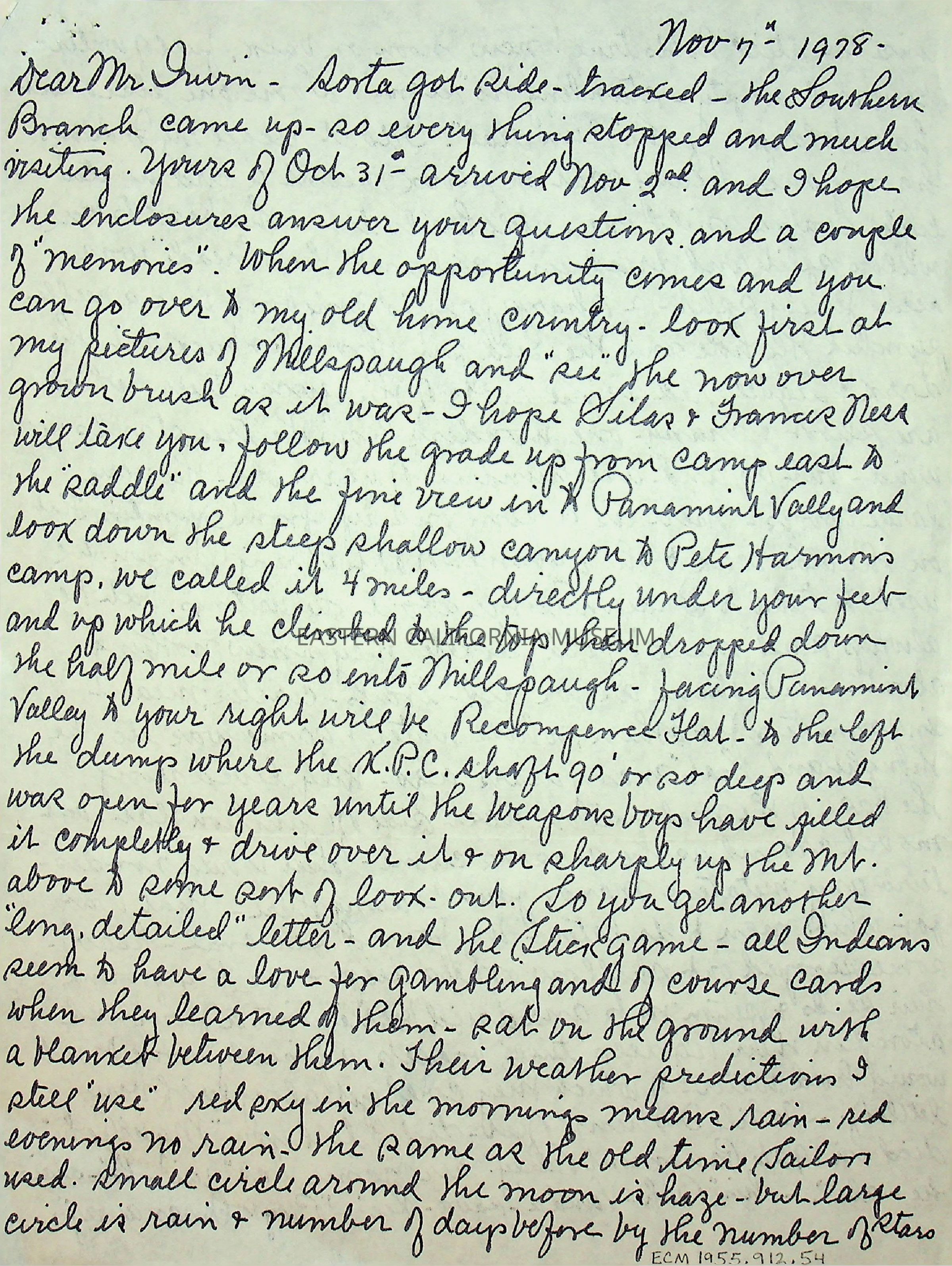 Three page, double sided letter from Elizabeth L. Mecham to [Charles] Irwin on 11/07/1978.