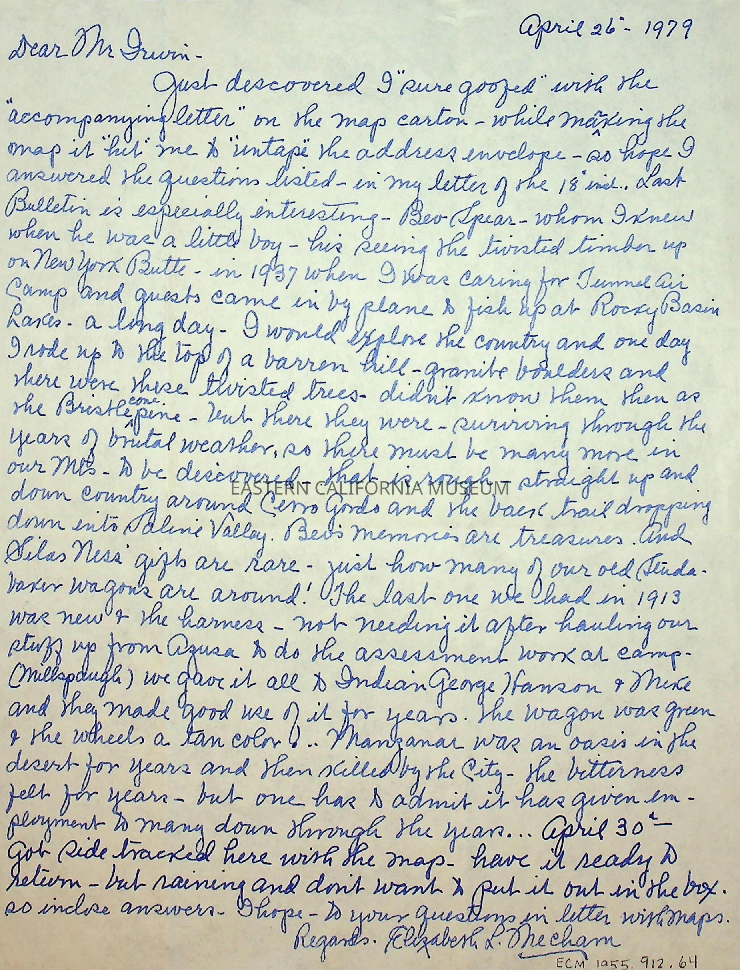 One page, single sided letter from Elizabeth L. Mecham to [Charles] Irwin on 04/26/1979.