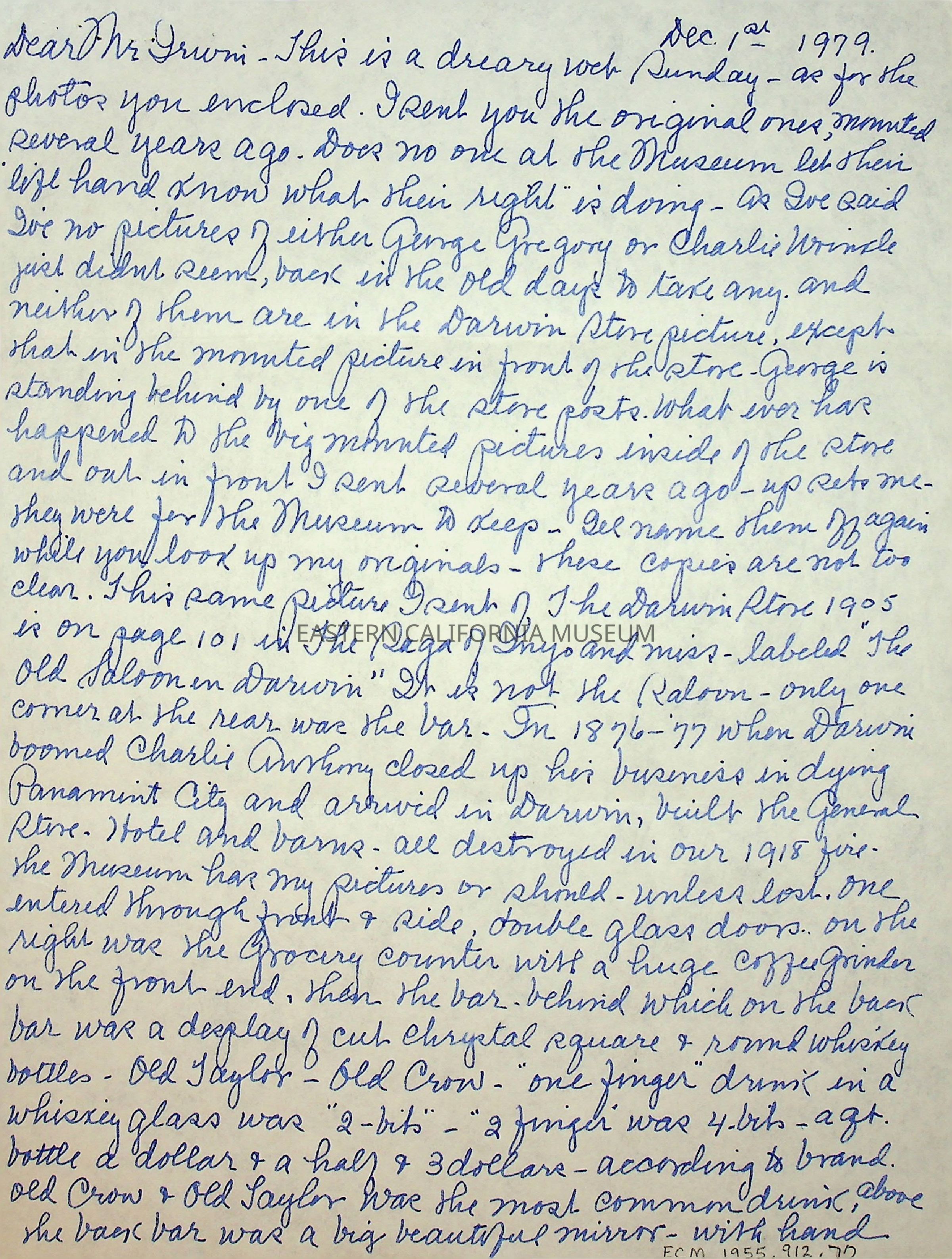 Four page, single sided (except for one page that is double sided) letter from Elizabeth L. Mecham to [Charles] Irwin on 12/01/1979.Collection