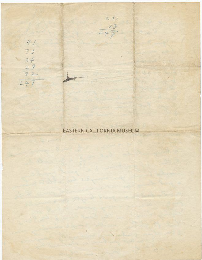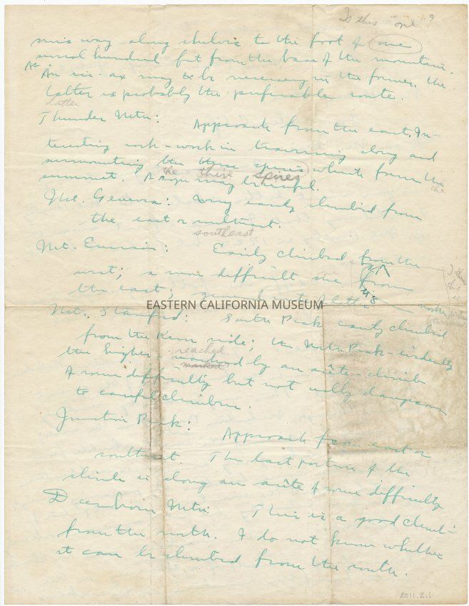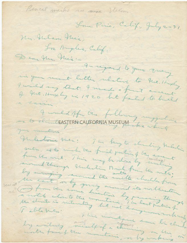 Three-page letter (on two pieces of paper) written in green ink by Norman Clyde to Nelson Nies on July 2, 1931. Letter has been folded several times, but is overall in good to fair condition. There are pencil notes throughout the letter where the recipiant has clarified some of Norman Clyde's writing.