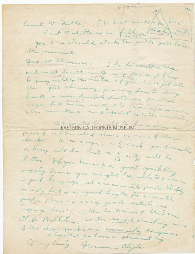 I would offer the following suggestions as to climbing the following peaks which you mention...I hope that you have a pleasant trip. Very truly, Norman Clyde