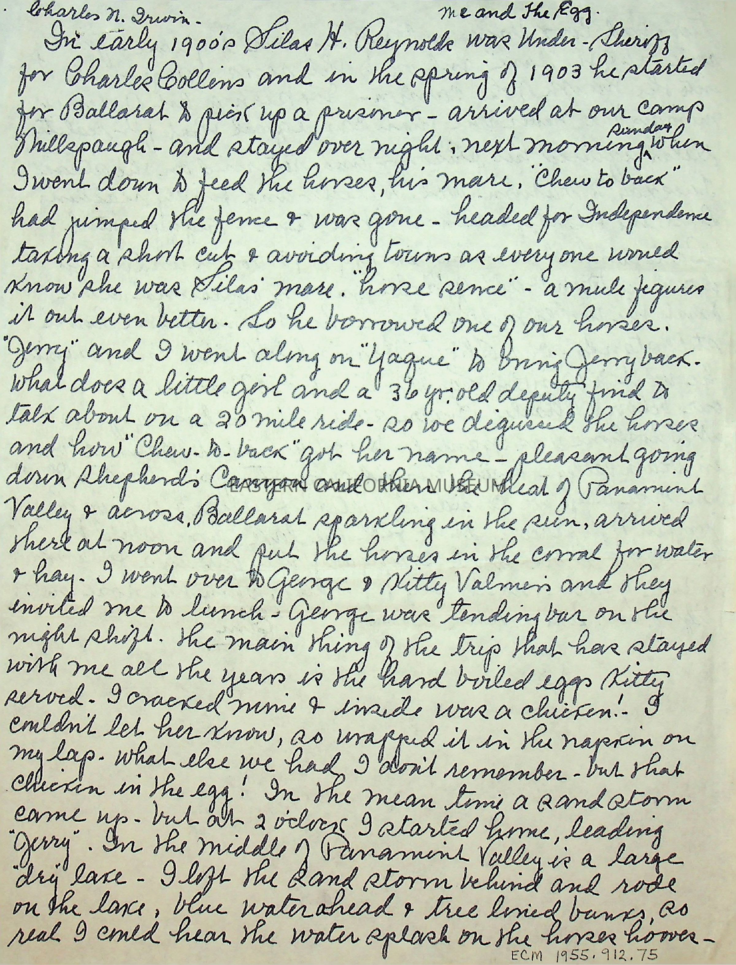 One page, double sided letter from Elizabeth L. Mecham to Charles N. Irwin, no date. Seems like a manuscript rather than a proper letter.