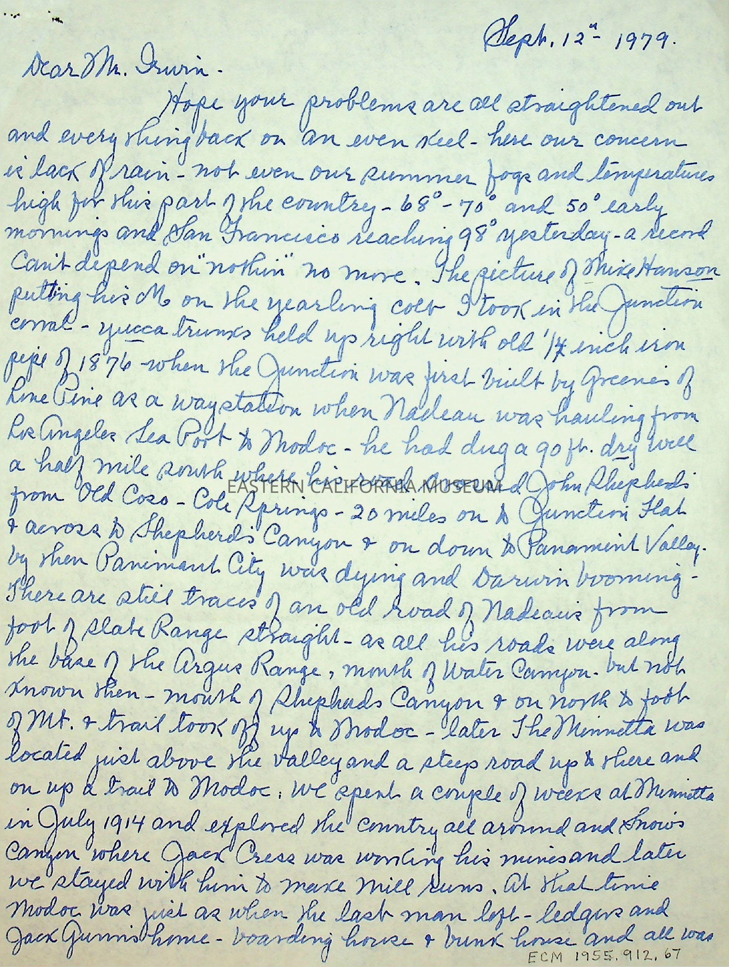 Four page, double sided letter from Elizabeth L. Mecham to [Charles] Irwin on 09/12/1979. Has an envelope with the letter.Collection