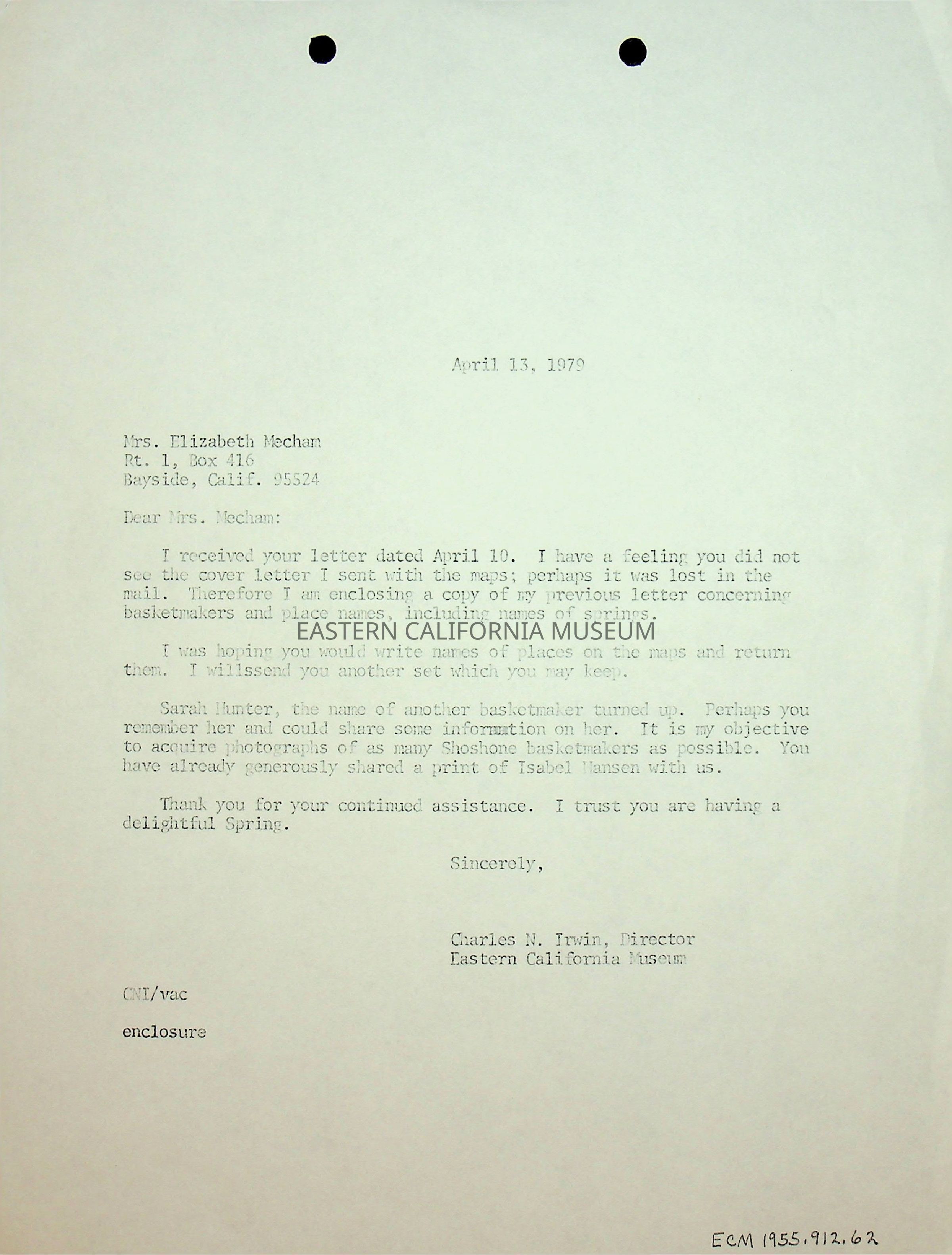 One page, single sided typewritten letter from Charles Irwin to Elizabeth L. Mecham on 04/13/1979.