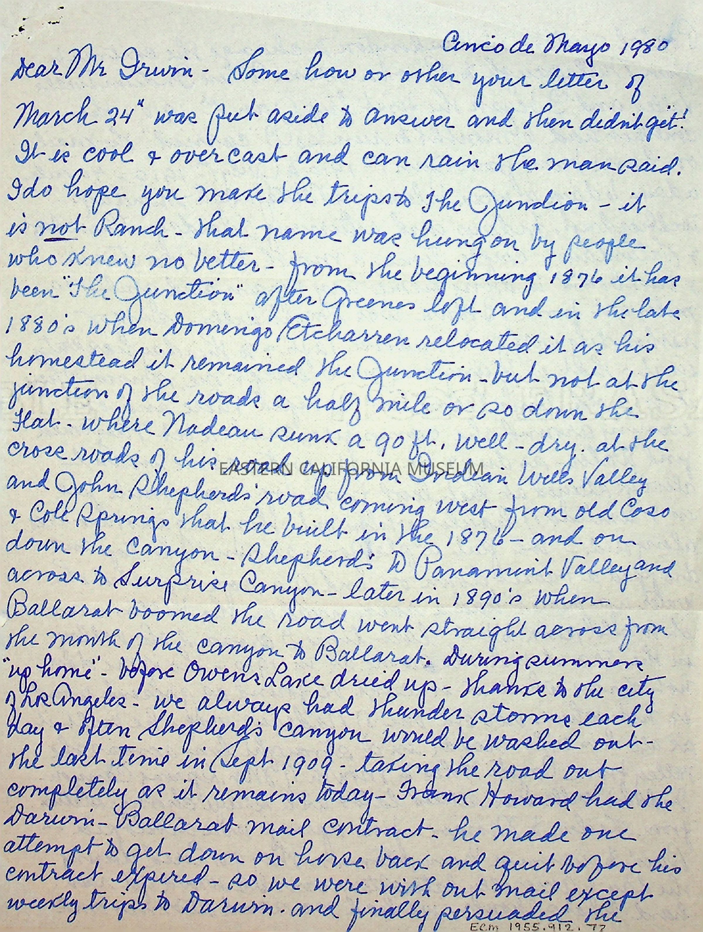 Four page, double sided letter from Elizabeth L. Mecham to [Charles] Irwin on 05/05/1980.