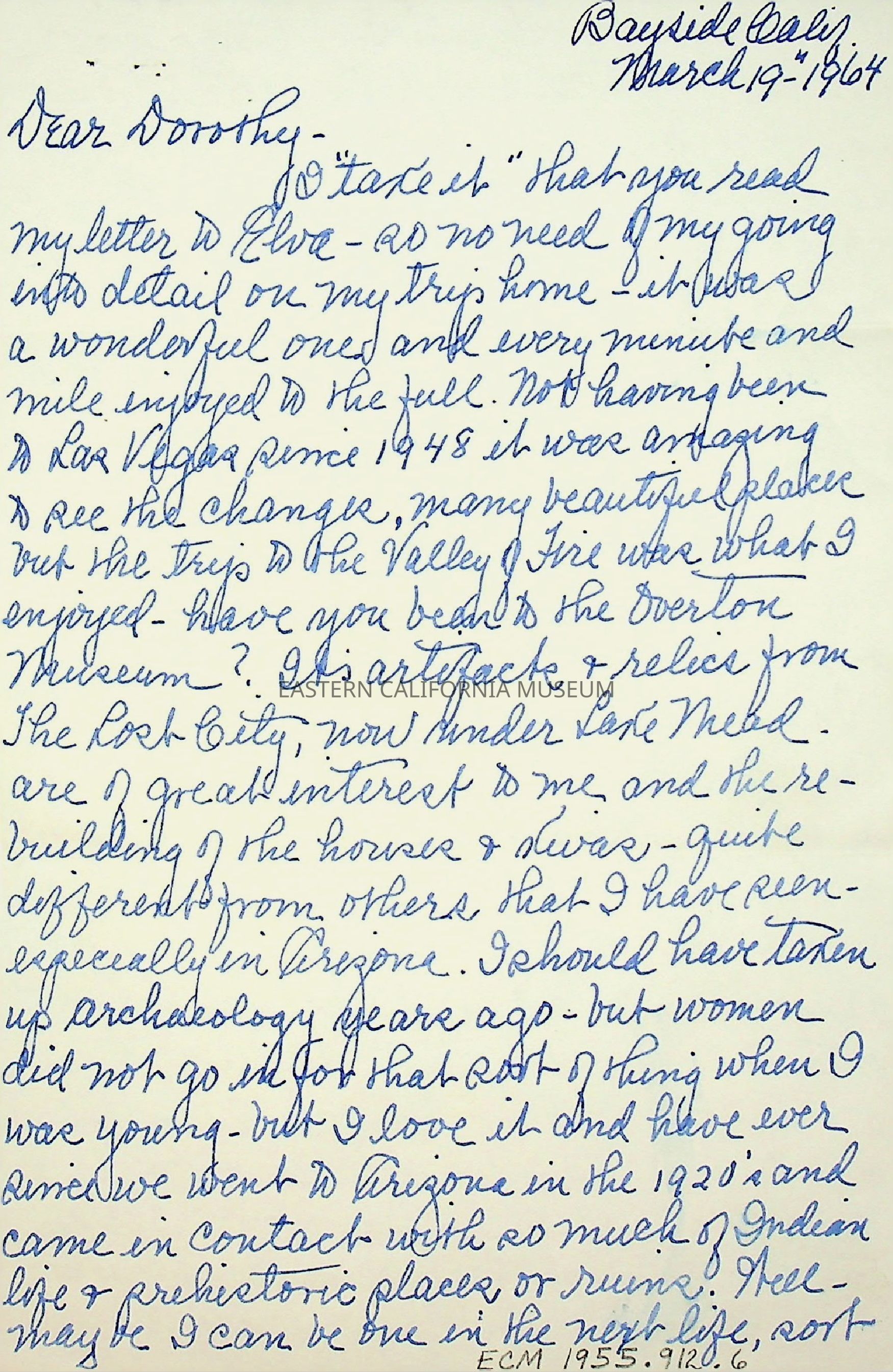 Three page, double sided letter from Elizabeth L. Mecham to Dorothy [Cragen] on 03/19/1964.