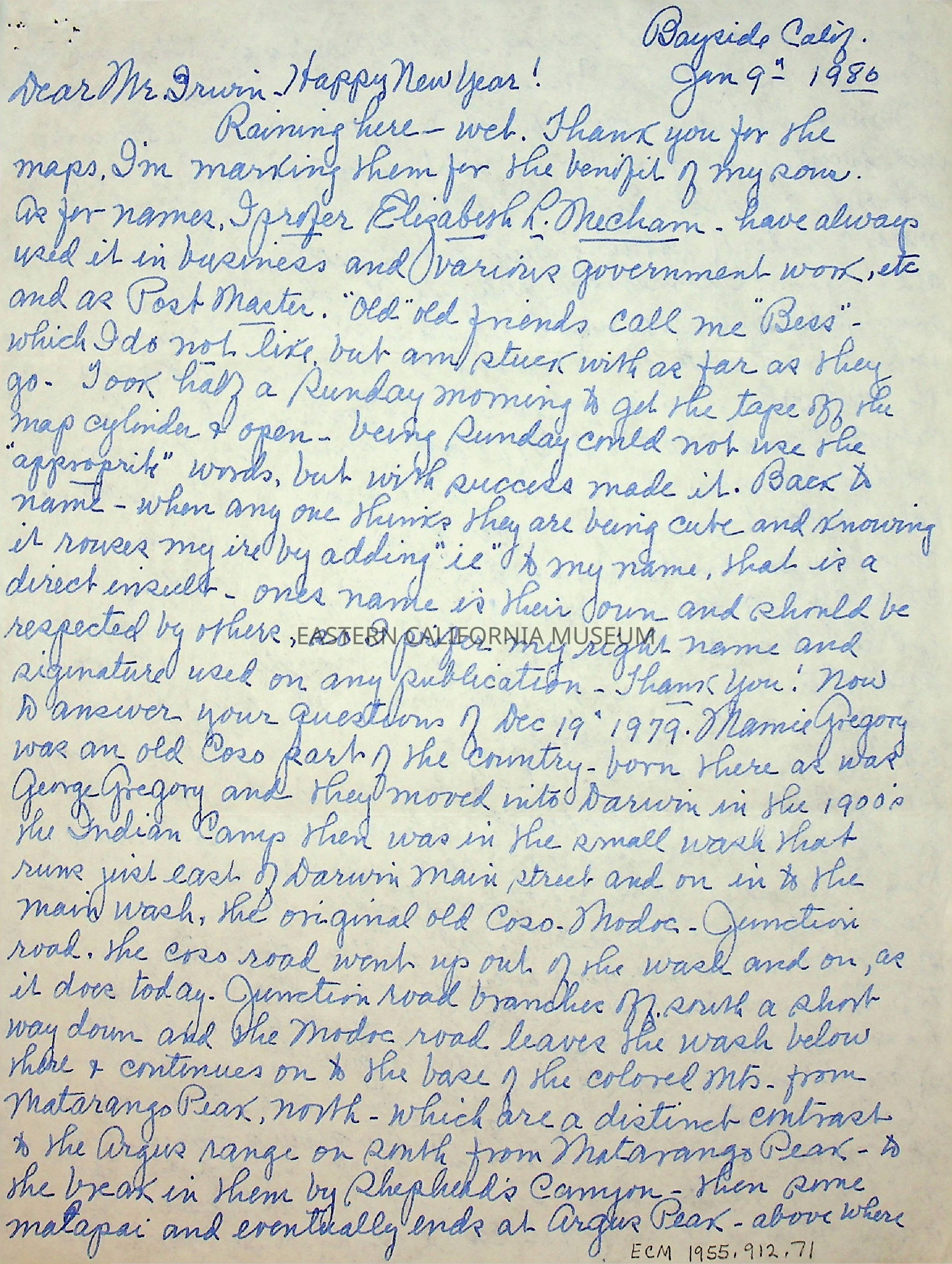 Five page, double sided letter from Elizabeth L. Mecham to [Charles] Irwin on 01/09/1980. Has an envelope with the letter.