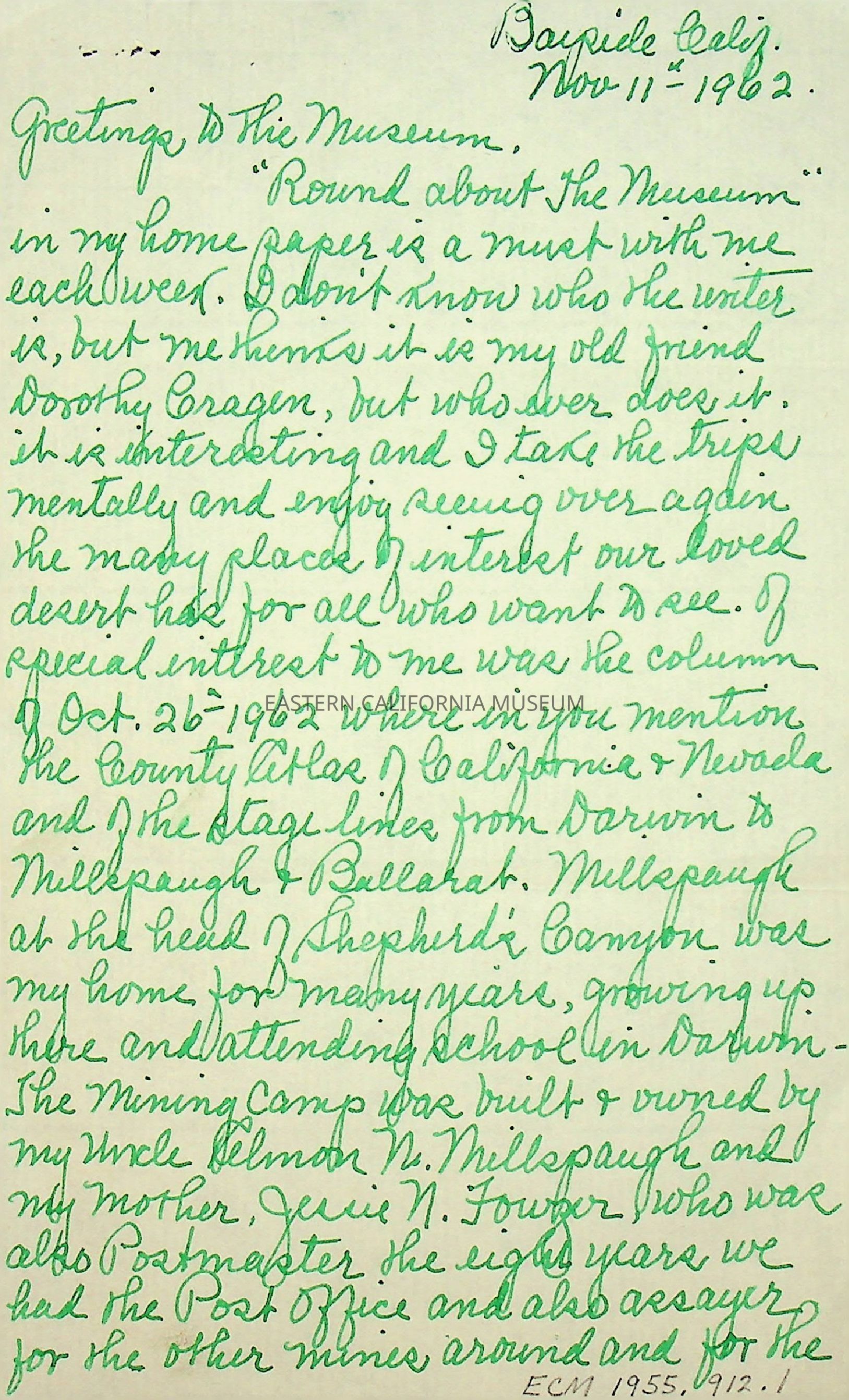 Three page, single sided letter from Elizabeth L. Mecham to "the museum" on 11/11/1962.