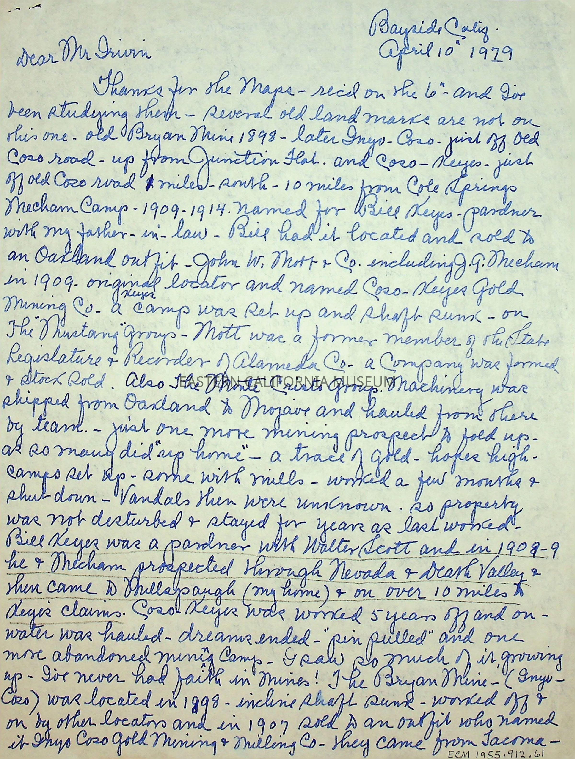 One page, double sided letter from Elizabeth L. Mecham to [Charles] Irwin on 04/10/1979.
