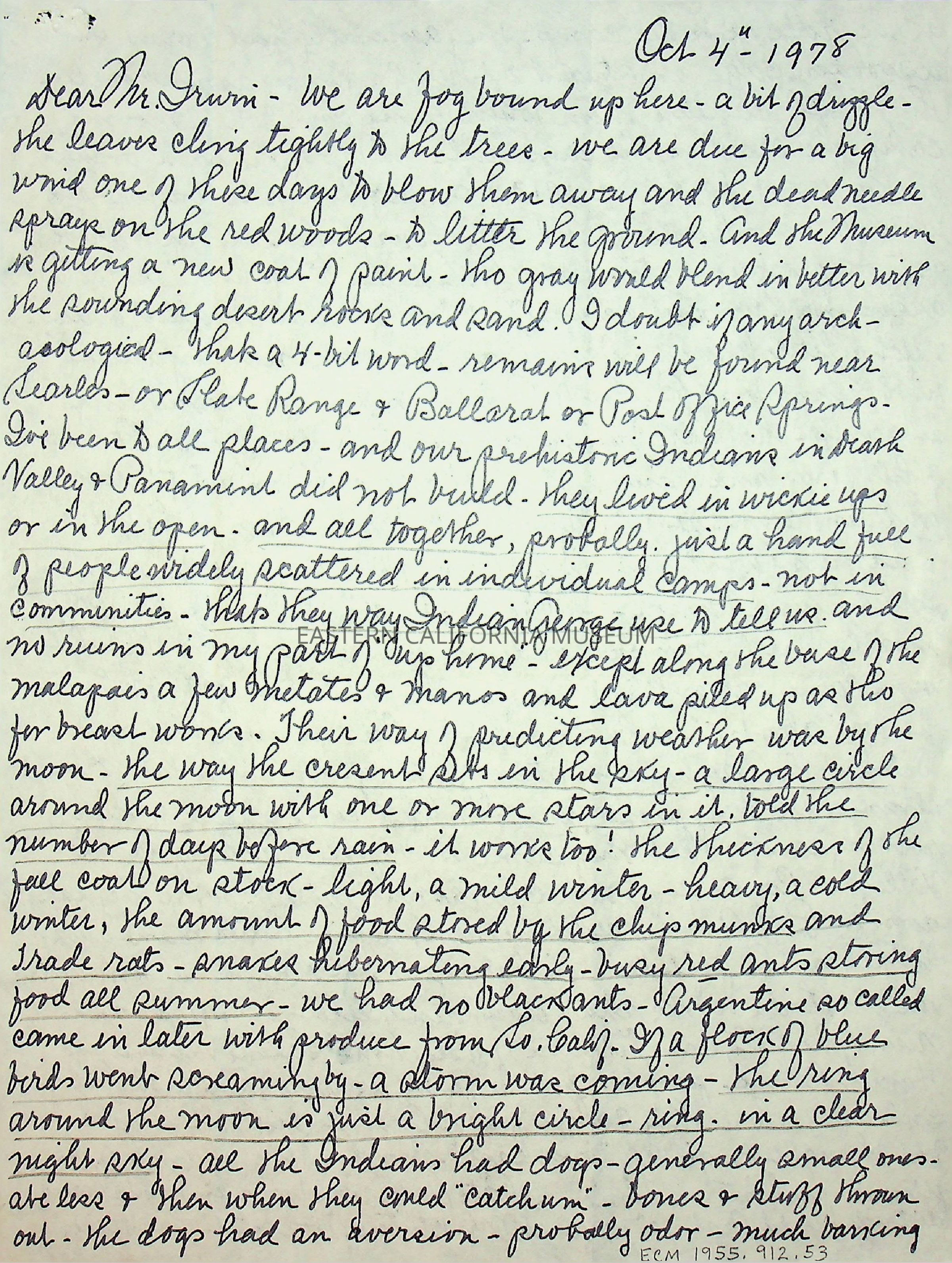 Three page, double sided letter from Elizabeth L. Mecham to [Charles] Irwin on 10/04/1978.